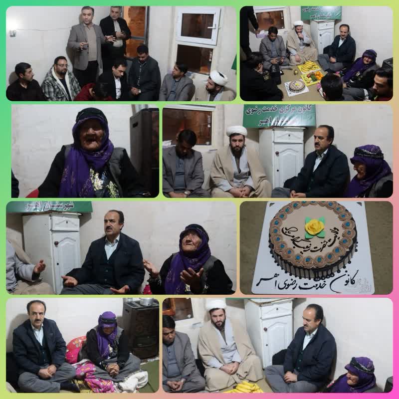 خادمیاران دسته جمعی با نوای یا رضا رضا، در منزل ننه مانوسه با کیک، میوه و شیرینی حاضر شدند تا ولادت حضرت زینب کبری(س) را در خانه تازه ساخت این مادر مهربان که توسط خیرین و خادمیاران اهری احداث شده است جشن بگیرند.