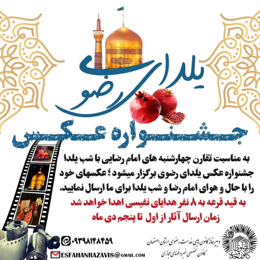 ستوده در خصوص جشنواره عکس یلدای رضوی افزود: امسال با توجه به تقارن چهارشنبه امام رضایی با شب یلدا، جشنواره عکس یلدای رضوی برگزار می شود و همه مردم ولایت مدار استان پهناور اصفهان می توانند عکس های خود را با حال و هوای امام رضا و شب یلدا که در مسجد محل یا منزل می گیرند به شماره ۰۹۳۹۸۱۴۸۴۵۹ ارسال نمایند یا به نشانی Esfahanrazavi8@gmail.com ایمیل کنند و به قید قرعه به نیت امام مهربانی ها به ۸ نفر هدایای نفیسی اهداء خواهد شد.