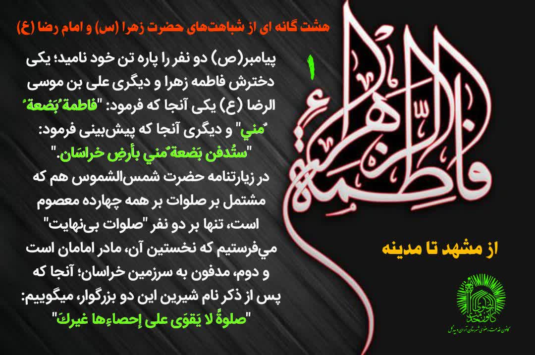 وی با بیان اینکه یاور رضوی دومین خصلت مشابه حضرت زهرا(س) و امام رضا(ع) را با توجه به زیارتنامه حضرت شمسالشموس که مشتمل بر صلوات بر چهارده معصوم است عنوان و اضافه کرد: با استناد به این زیارتنامه، "صلوات بینهايت" نخست بر مادر امامان و دوم بر مدفون در سرزمين خراسان با عبارت "صلوةً لا يَقوَى على إحصاءِها غيركَ" فرستاده میشود.