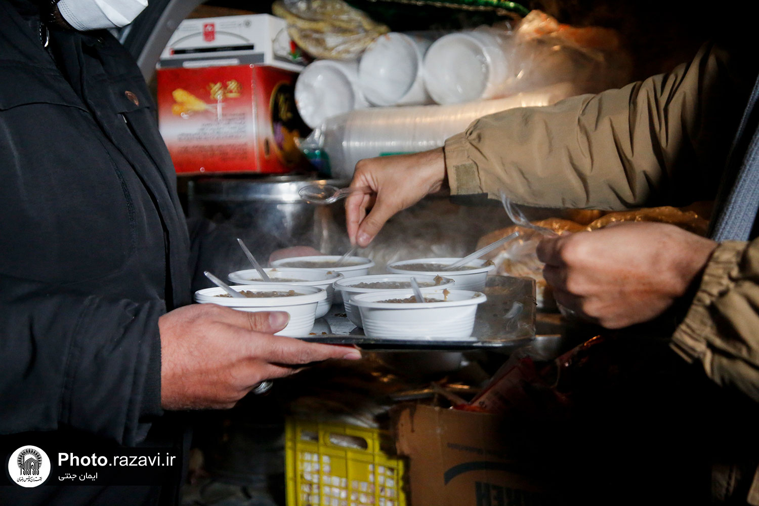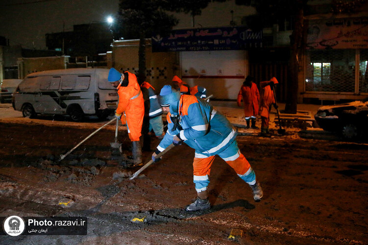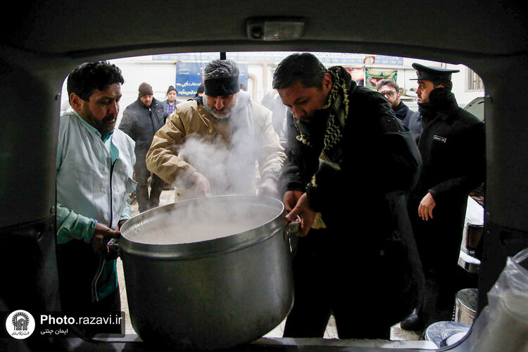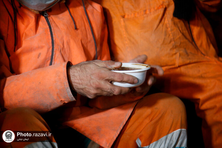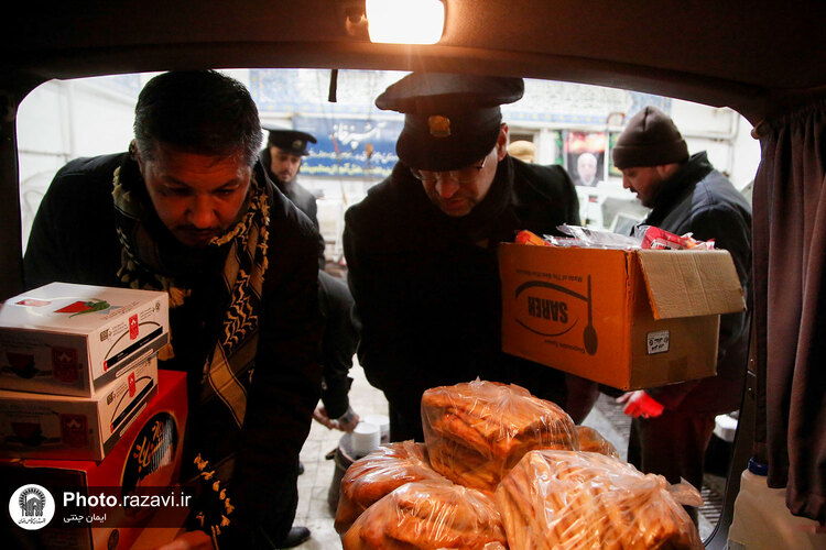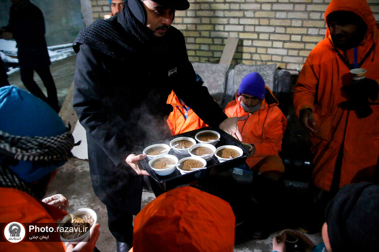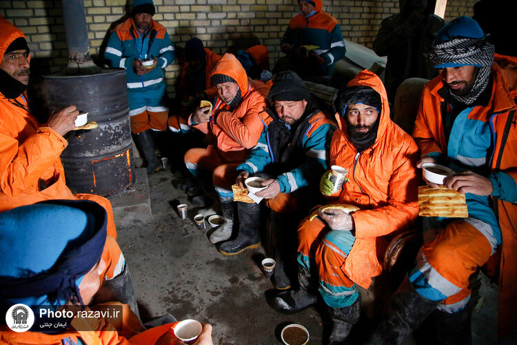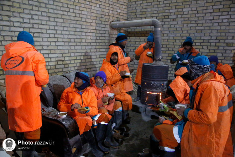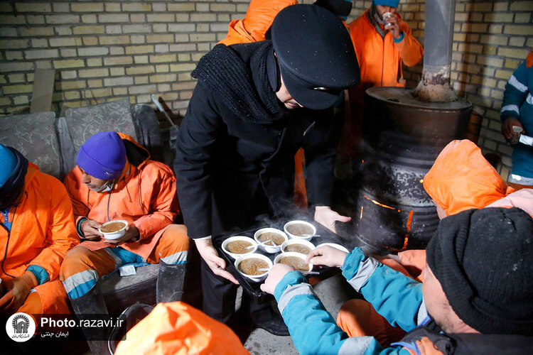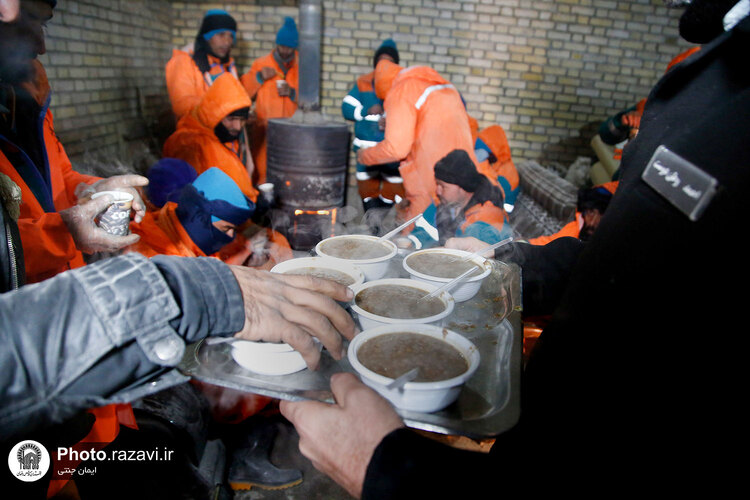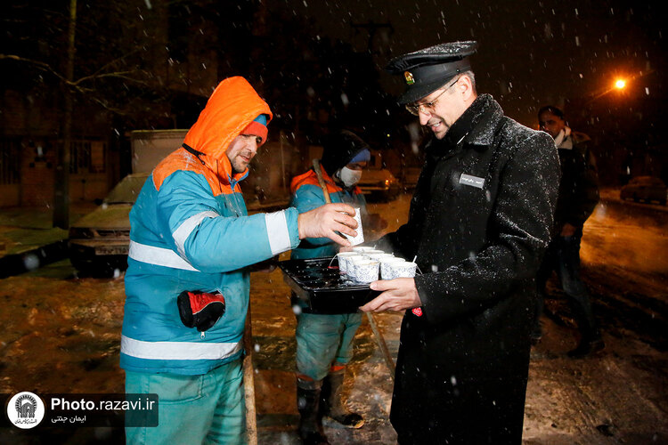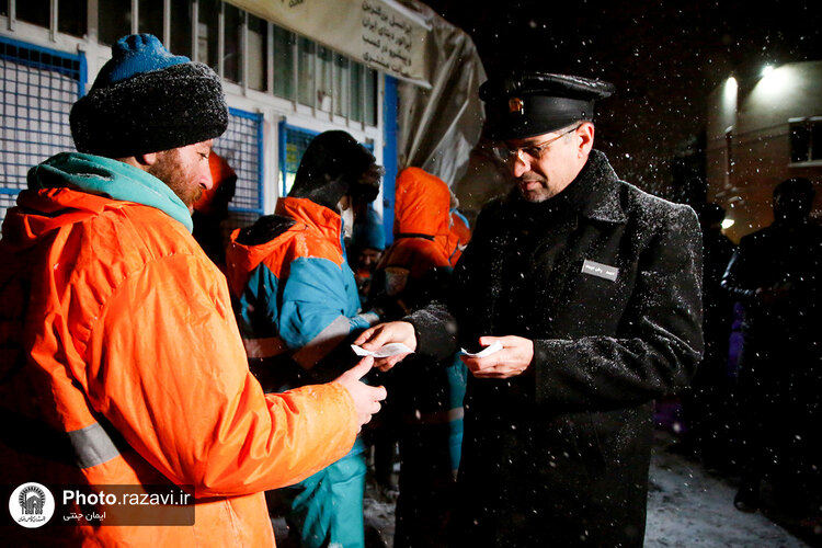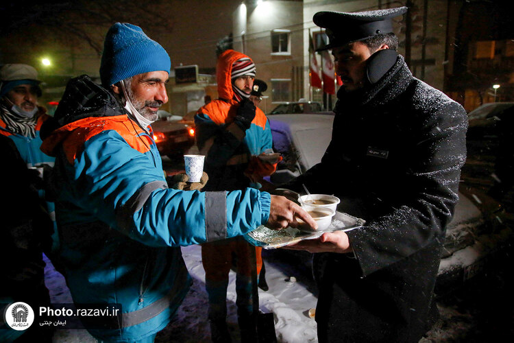 خدام حرم مطهر رضوی شامگاه سهشنبه ٢٠ دی ١۴٠١ با حضور در جمع نیروهای خدمترسان شهرداری هنگام بارش شدید برف در مشهد با غذا و نوشیدنی گرم از آنها پذیرایی کردند.