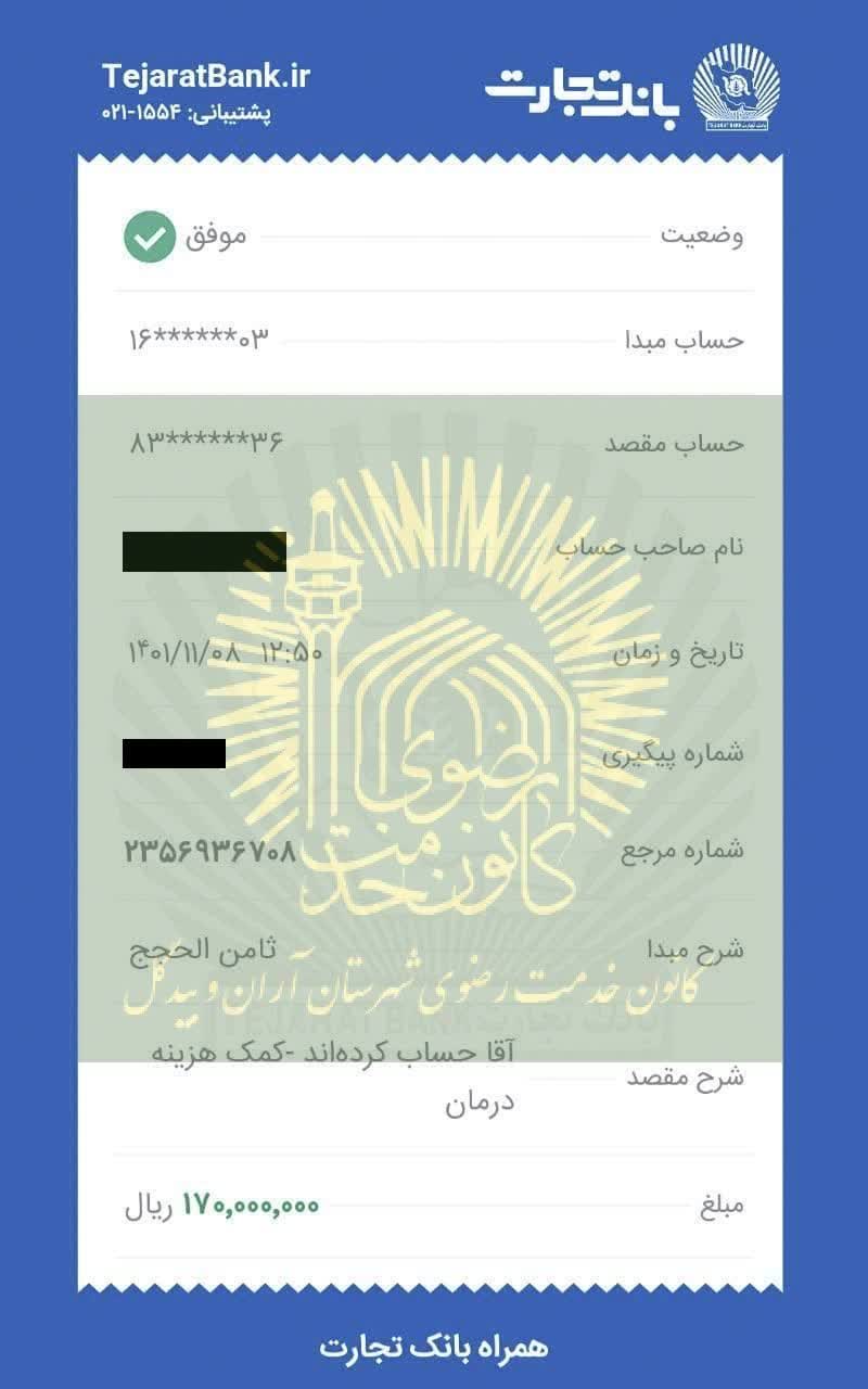 برای نمایش آرشیو پخش زنده کلیک کنیدبه گزارش آستان نیوز از اصفهان، مسئول کانون خدمت رضوی ثامن الحجج در شهرستان آران و بیدگل گفت: خیر و یاور رضوی این کانون با اجرای «طرح آقا حساب کردند» و شعار « نجات انسان رسم مسلمانی» تمام هزینههای جراحی، بستری، دارو و ترخیص یک بیمار سرپرست خانواده را به مبلغ ۱۷ میلیون تومان پرداخت کرد که با همکاری یکی از مراکز خیریه در اختیار این نیازمند قرار گرفت.