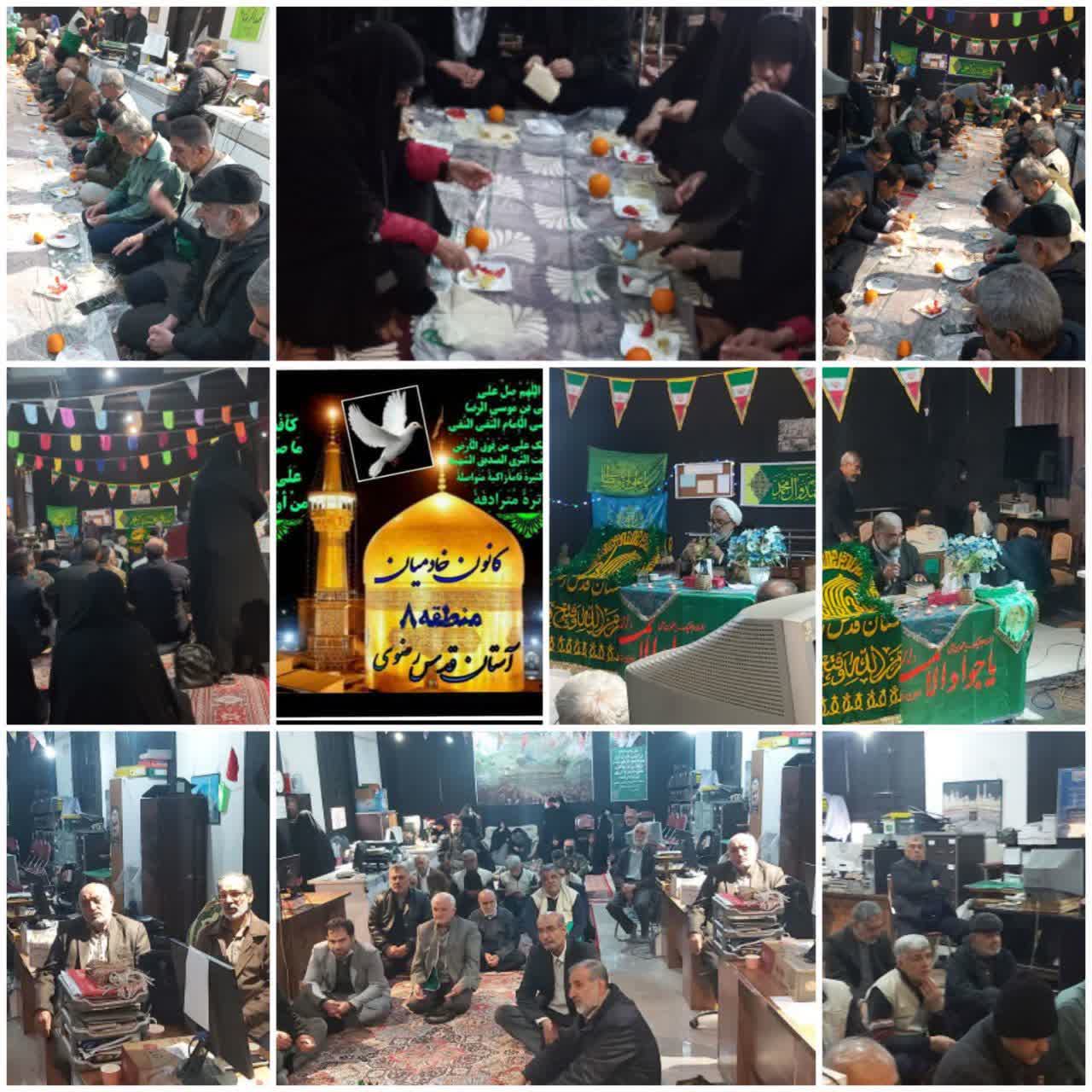 این جشن با حضور مهدیار مدیر کانون های خدمت رضوی استان، خادمياران ستادی دبیرخانه استانی، خادمياران منطقه‌ هشت و خادمیاران سایر مناطق با مداحی مداح اهل بیت کاظم محمدی با قرائت زیارت خاصه جواد الائمه و زیارت امین الله و مداحی برای میلاد امام جواد آغاز شد و سپس سخنران در خصوص فضائل این امام همام ايراد سخنرانی نمود و در پایان از کلیه خادمیاران  با میوه و شکلات و صبحانه پذیرایی گردید