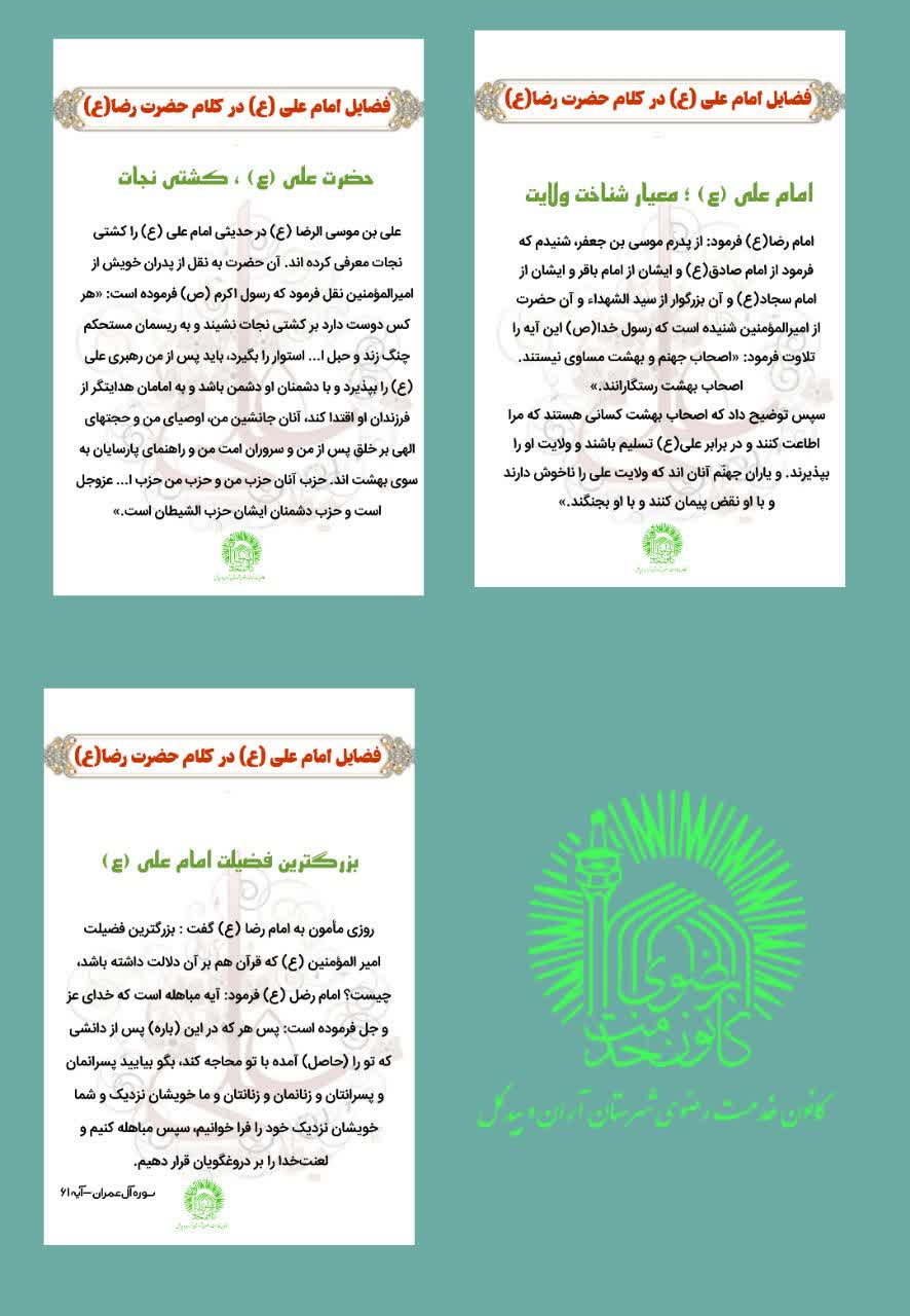 به گزارش آستان نیوز از اصفهان، دبیر کانون‌های خدمت رضوی در شهرستان آران و بیدگل گفت: معصومه سادات مرتضوی یاور رسمی کانون تخصصی خبر و فضای مجازی در آران و بیدگل با استفاده از منابع و کتب دینی از جمله عیون اخبار الرضا(ع) و بحارالانوار دفاع از تشیع، بحث هاى کلامى شیخ مفید(ره)» سه روایت با سه شاخصه مهم علوی شامل امام علی(ع) معیار شناخت ولایت، امام علی(ع) کشتی نجات و بزرگترین فضیلت آن حضرت را برای تولید محتوا در فضای مجازی انتخاب و در قالب عکس نوشت بیان کرده است.