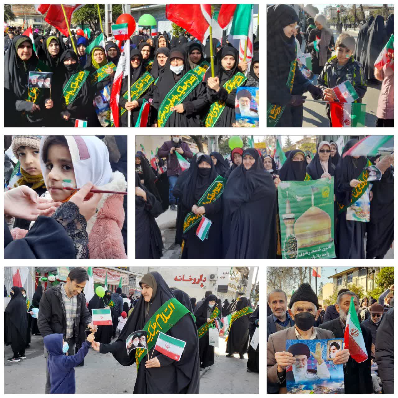 در ادامه خادمیاران رضوی به همراه خانواده هایشان با در دست داشتن پلاکاردها و پرچم انقلاب اسلامی پرشورتر و با صلابت تر از همیشه در راهپیمایی چهل و چهارمین سالروز پیروزی انقلاب اسلامی امسال حضور یافته و بار دیگر با آرمان های امام راحل و مقام معظم رهبری تجدید میثاق کردند.