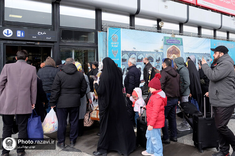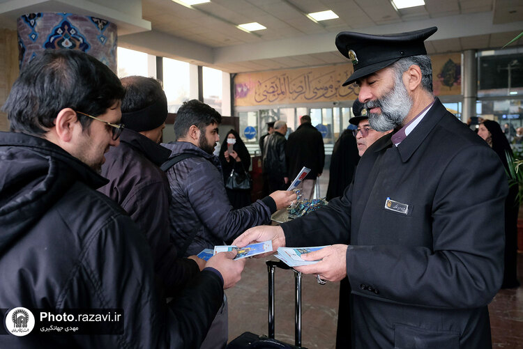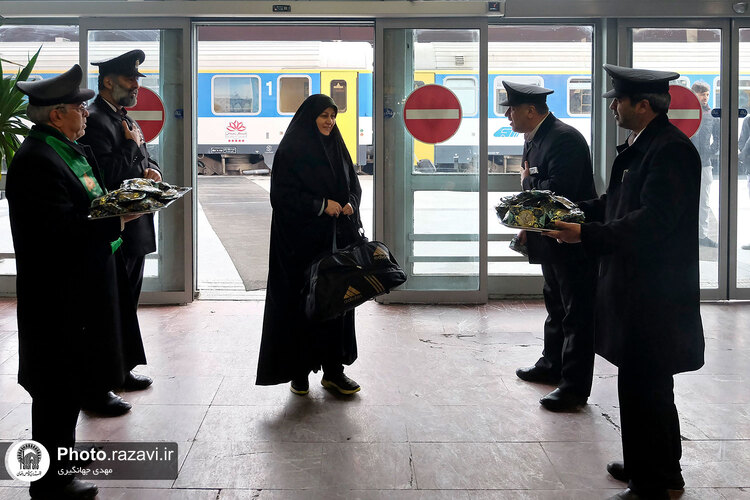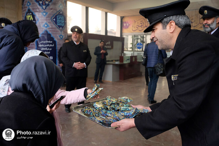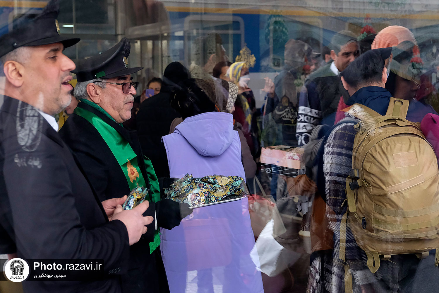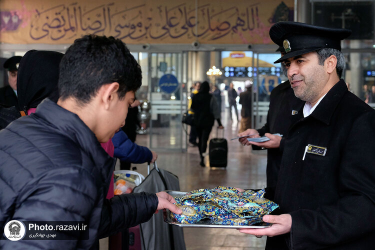 به مناسبت مبعت پیامبر اکرم(صلی الله علیه و آله)، خدام حرم مطهر رضوی در ایستگاه راهآهن مشهد مقدس با بستههای نمک و نبات متبرک از زائران استقبال کردند.