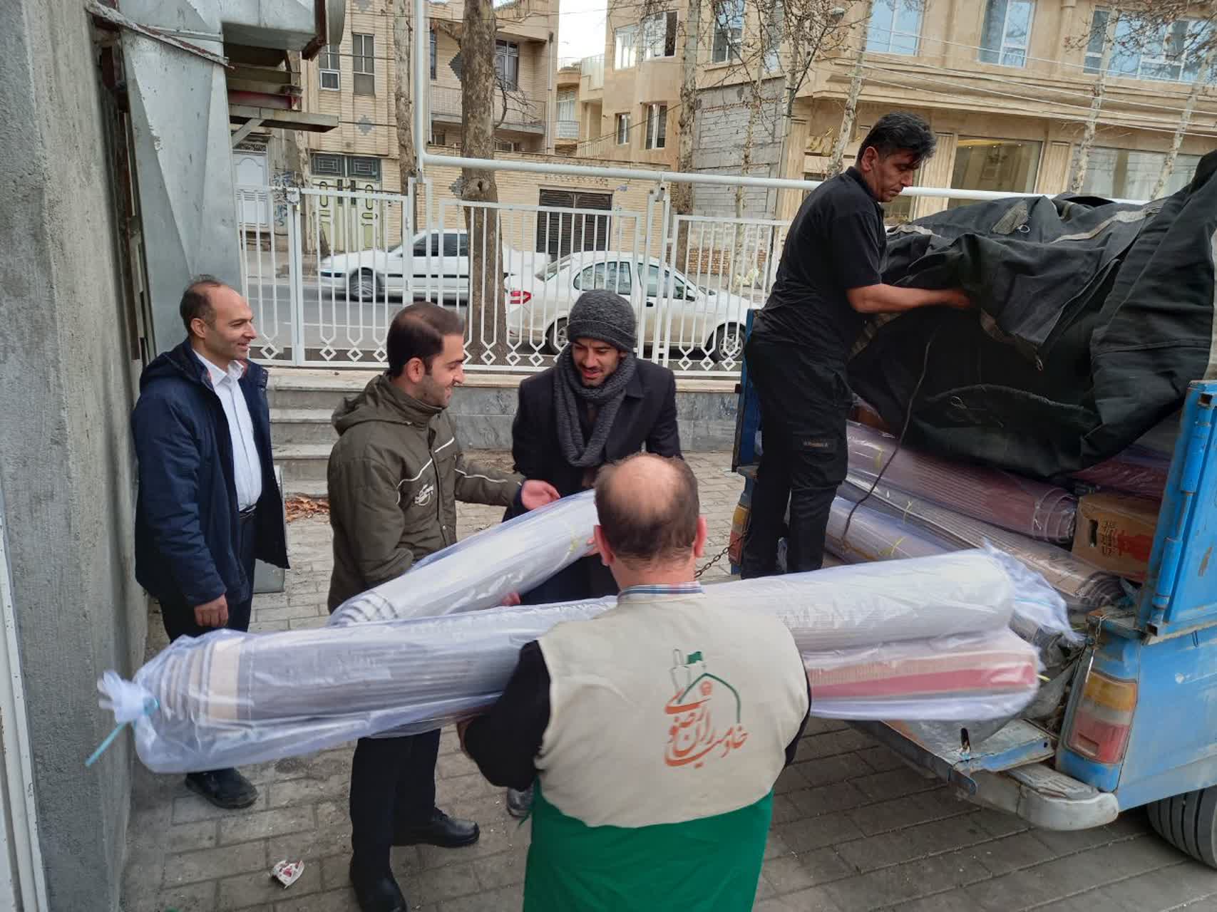 خادمیاران کانون های خدمت رضوی شهرستان آران و بیدگل استان اصفهان نیز یک محموله شامل برنج ایرانی و خارجی، سویا، نبات، ماکارونی، چای خشک، شکر، رب گوجه، مخزن گاز ۲ کیلویی، کفش بچه گانه، کفش مردانه، قند، روغن مایع، پوشک بچه، کمپوت، کنسرو، تن ماهی، چای کیسه ای، انواع حبوبات، بیسکویت، توپ بازی، انواع لباس نو، لوازم التحریر، پودر ماشین لباسشویی، کفش ورزشی، پتو مسافرتی، لوازم ورزشی، انواع اسباب بازی، گچ تحریر، لوازم بهداشتی، خرما، کلوچه،۴۰ تخته فرش کوچک جمع آوری و به خوی ارسال کردند.