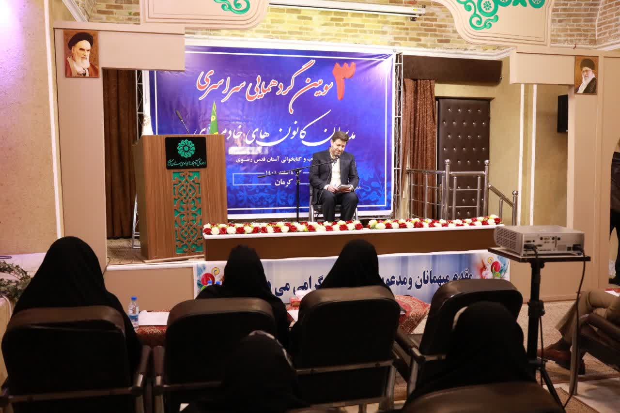 برای نمایش آرشیو پخش زنده کلیک کنیدبه گزارش آستان نیوز از کرمان مریم حجت، مسئول کانون تخصصی کتاب و کتابخوانی رضوی استان کرمان در جمع مسئولین کانون های خادمیاری کشور ضمن ابراز خرسندی از میزبانی دیار مقاومت در این گردهمایی با ارائه گزارشی مختصر از عملکرد این کانون خدمتی در استان بیان کرد: کانون تخصصی کتاب و کتابخوانی کرمان به منظور ترویج فرهنگ مطالعه و اشاعه سیره رضوی در ابتدای فعالیت با ۳۰ خادمیار به اجرای برنامه های کتاب محور پرداخت.