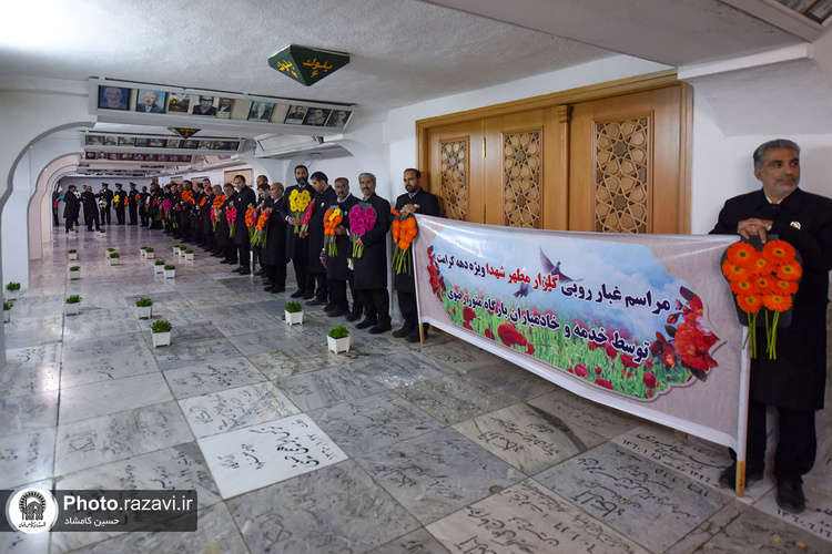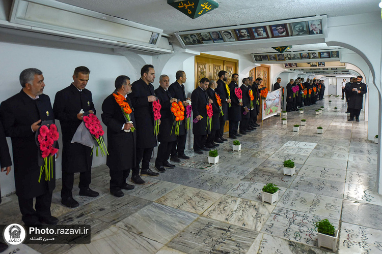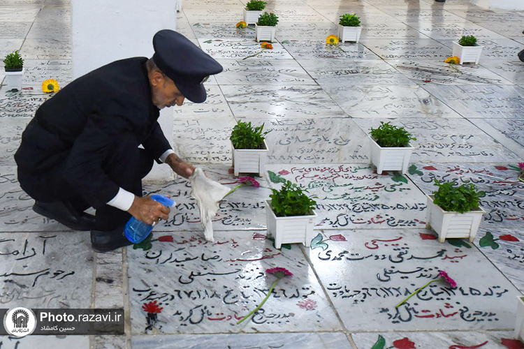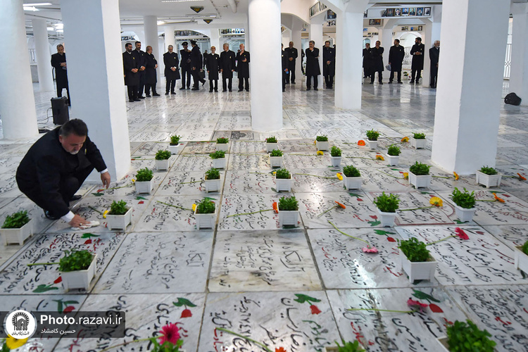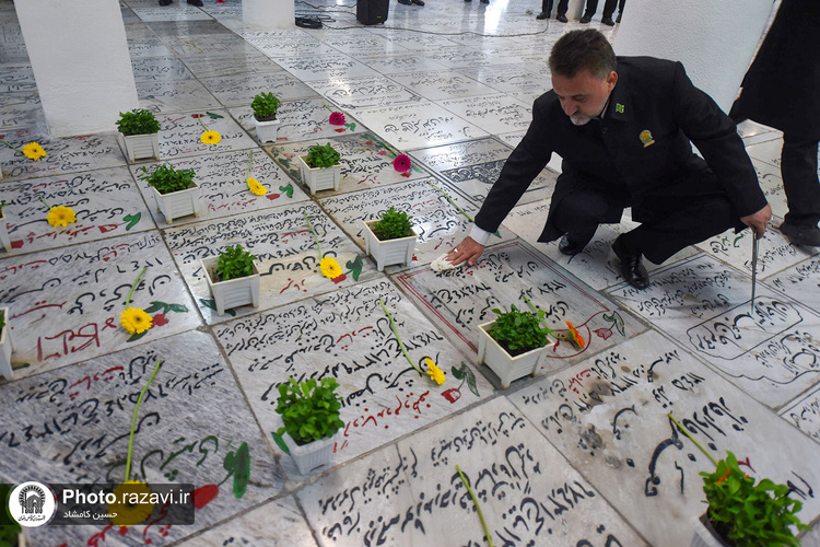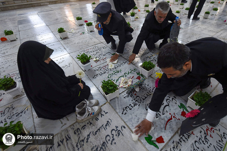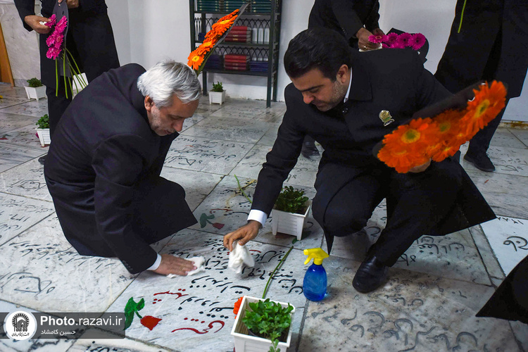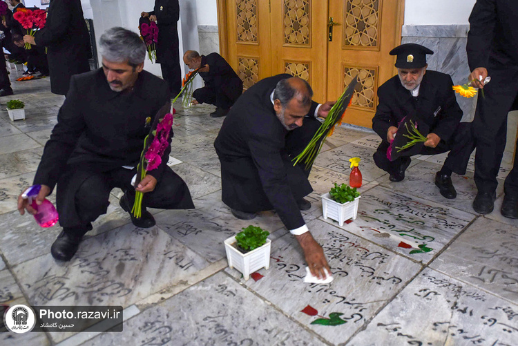 آیین غبارروبی مزار شهدای مدفون در حرم مطهر رضوی به مناسبت دهه کرامت روز پنجشنبه 4 خرداد 1402 توسط خادمان و خادمیاران حرم امام رضا(علیهالسلام) برگزار شد.