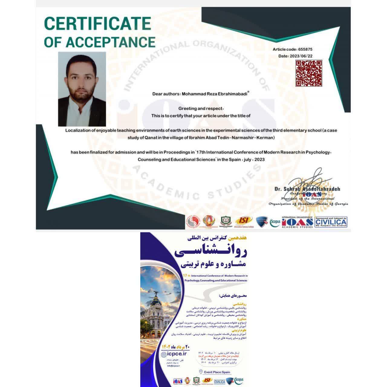 برای نمایش آرشیو پخش زنده کلیک کنیدبه گزارش آستان نیوز از کرمان، پس از اعلام اسامی مقالات برتر هفدهمین کنفرانس بین المللی روانشناسی، مشاوره و علوم تربیتی، مقاله علمی_پژوهشی خادمیار محمدرضا ابراهیم آبادی، مسئول آموزش ابتدایی مدیریت آموزش و پرورش شهرستان نرماشیر با موضوع بومی سازی محیط های آموزشی ابتدایی نیز، در بین نفرات برتر بود و جهت ارائه در این کنفرانس پذیرفته شده است.
