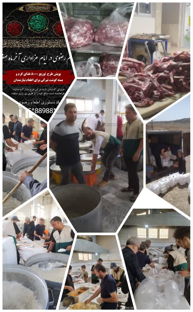 برای نمایش آرشیو پخش زنده کلیک کنیدبه گزارش آستان نیوز مسئول واحد اطعام و ارزاق کانون خیرین خدمت رضوی استان قم اظهار داشت: خادمیاران کانونهای خدمت رضوی به همراه یاوران رضوی در ایام حزن انگیز آخر ماه صفر، همزمان با ارتحال جانسوز پیامبر اعظم صلی الله علیه و آله و شهادت امام حسن مجتبی علیهالسلام، روز جمعه مورخ ۲۴ شهریور ۱۴۰۲ در قالب طرح اطعام رضوی ۶ هزار پرس و در روز شهادت امام رضا علیهالسلام شنبه مورخ ۲۵ شهریور ۱۴۰۲ تعداد ۴ هزار پرس غذای گرم و جمعا ۱۰۰۰۰ پرس را به ارزش۴۰۰ میلیون تومان در بین محرومین و شرکتکنندگان در مراسم و عزاداریها توزیع کردند.