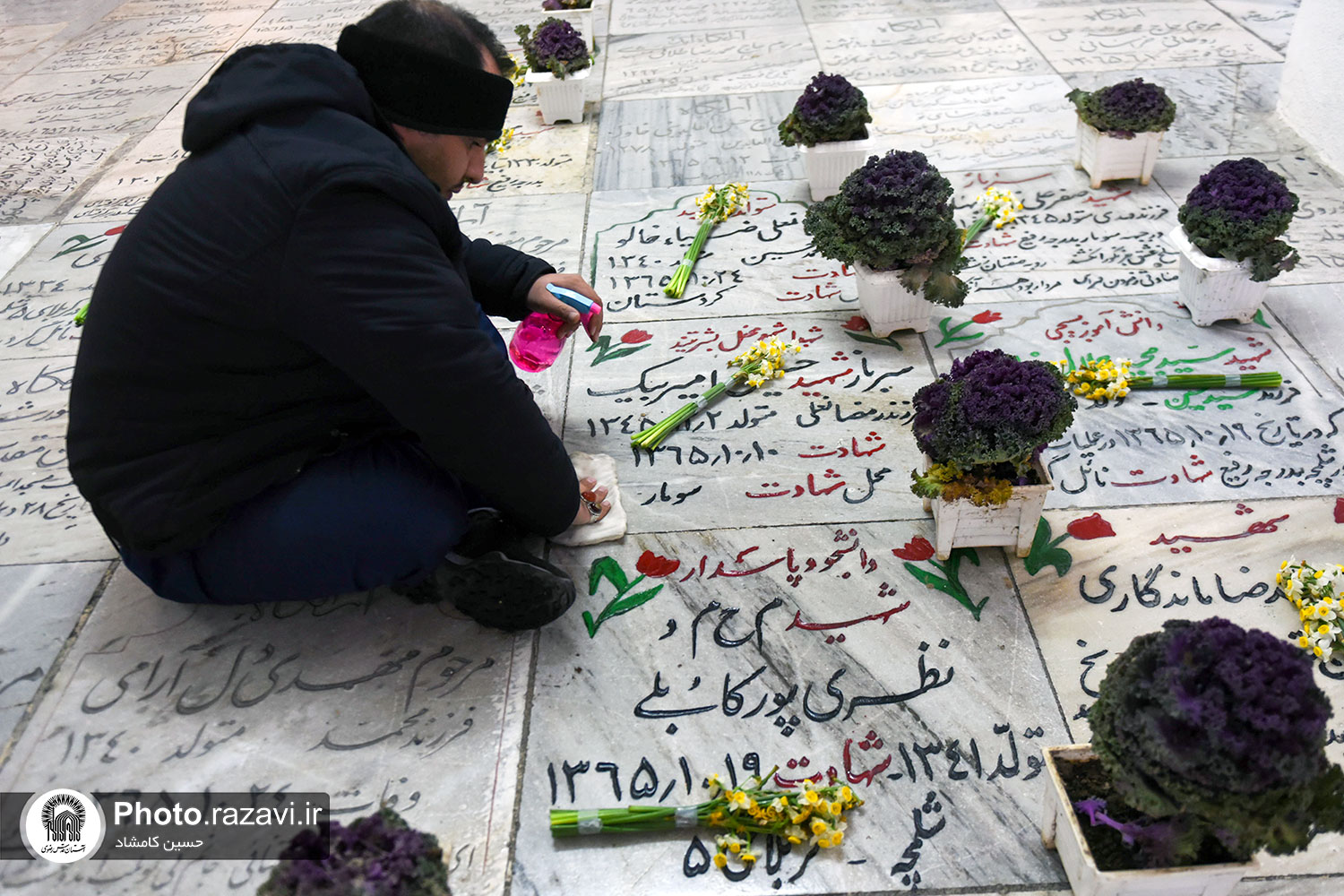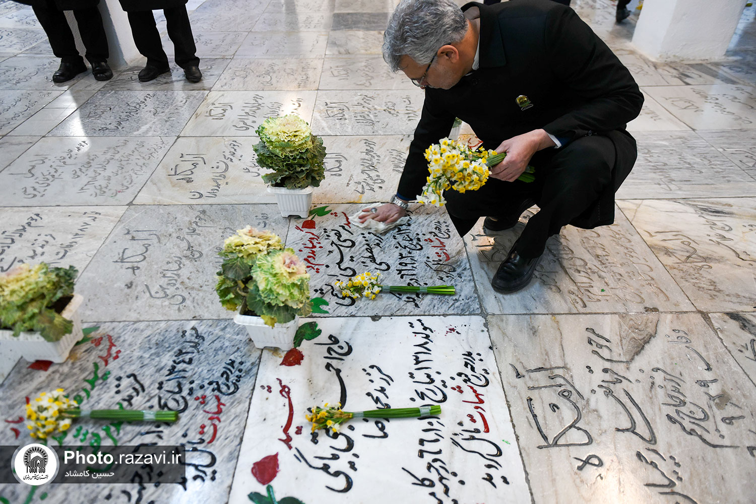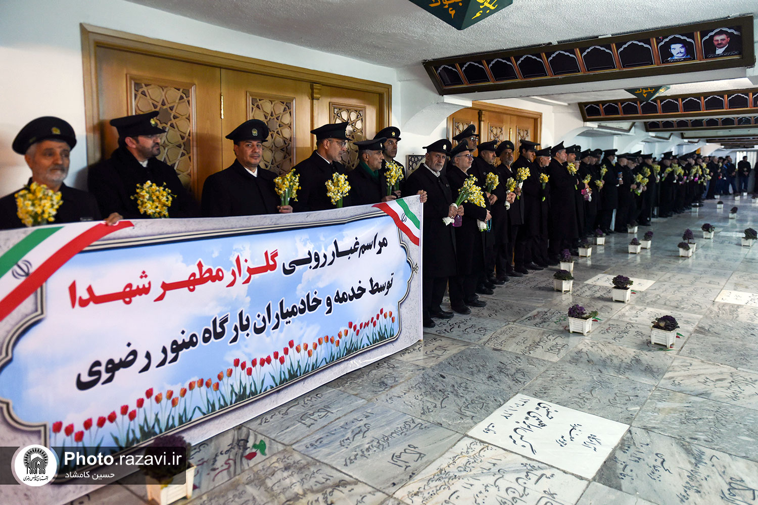 مراسم غبارروبی گلزار شهدای مدفون در حرم مطهر رضوی، همزمان با آغاز دهه فجر روز پنجشنبه 12 بهمن 1402 به همت خدمه و خادمیاران بارگاه منور رضوی در بهشت ثامن حرم امام رضا علیهالسلام برگزار شد.