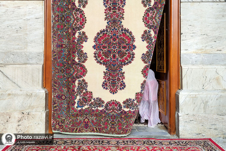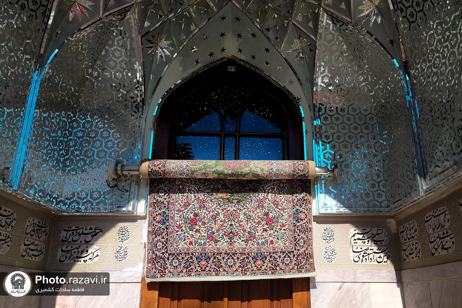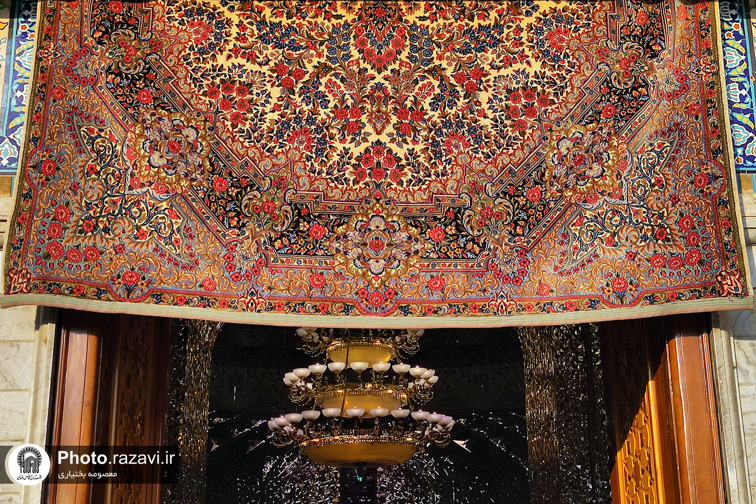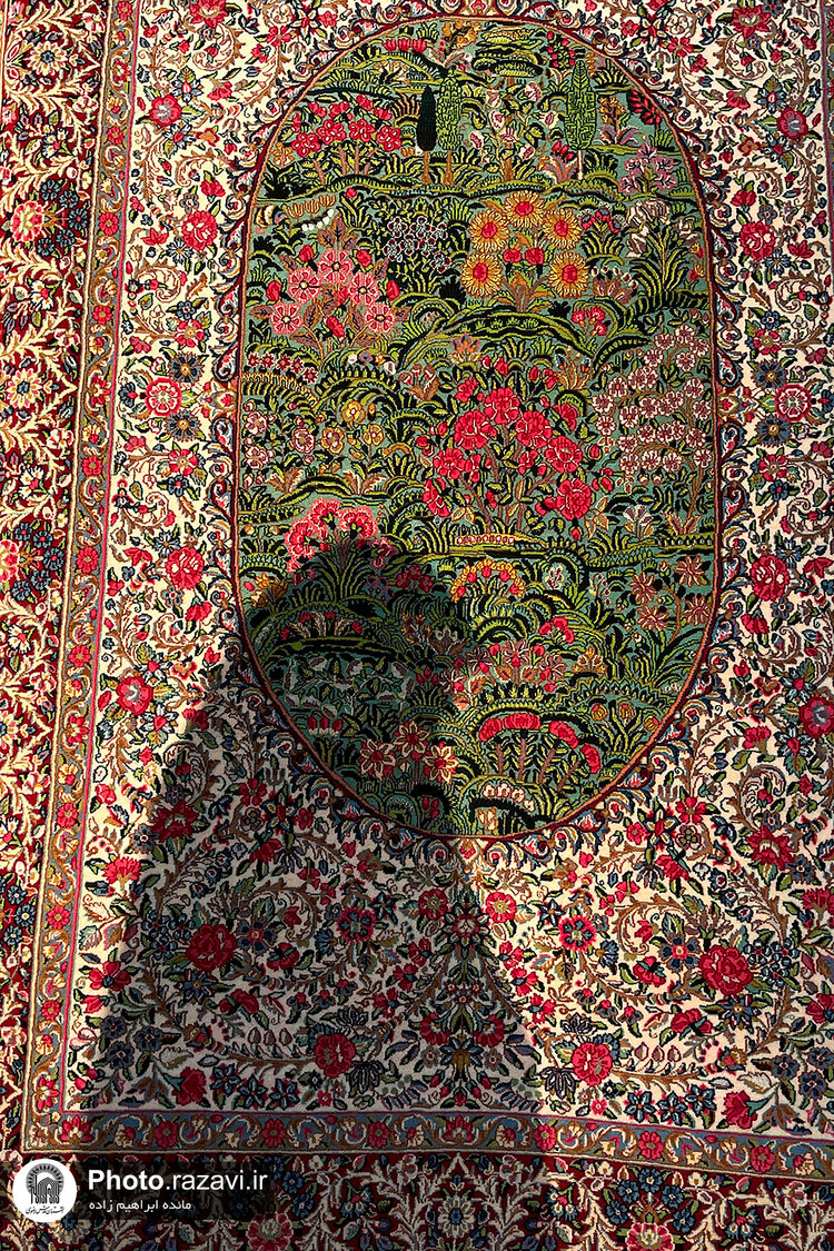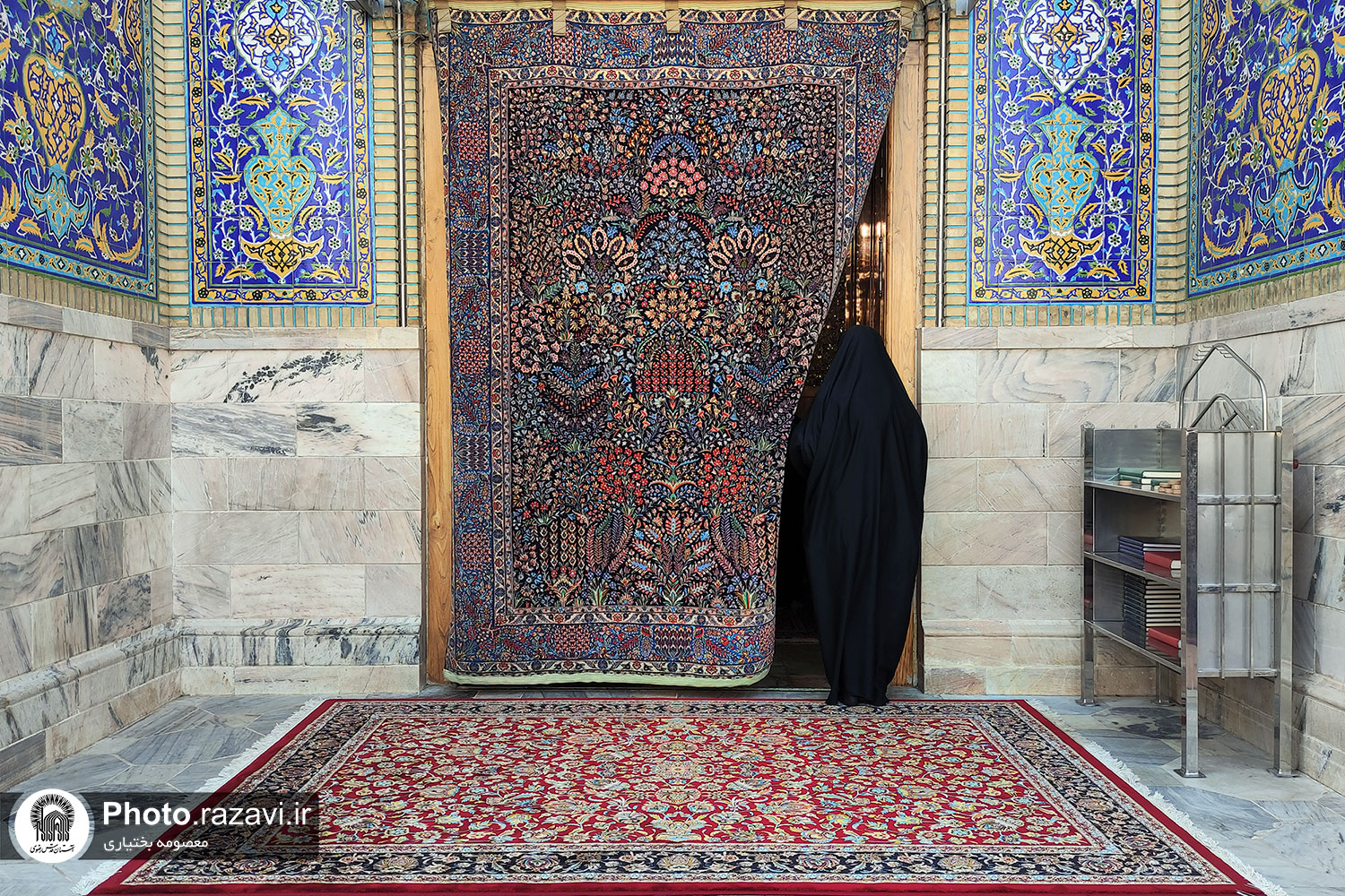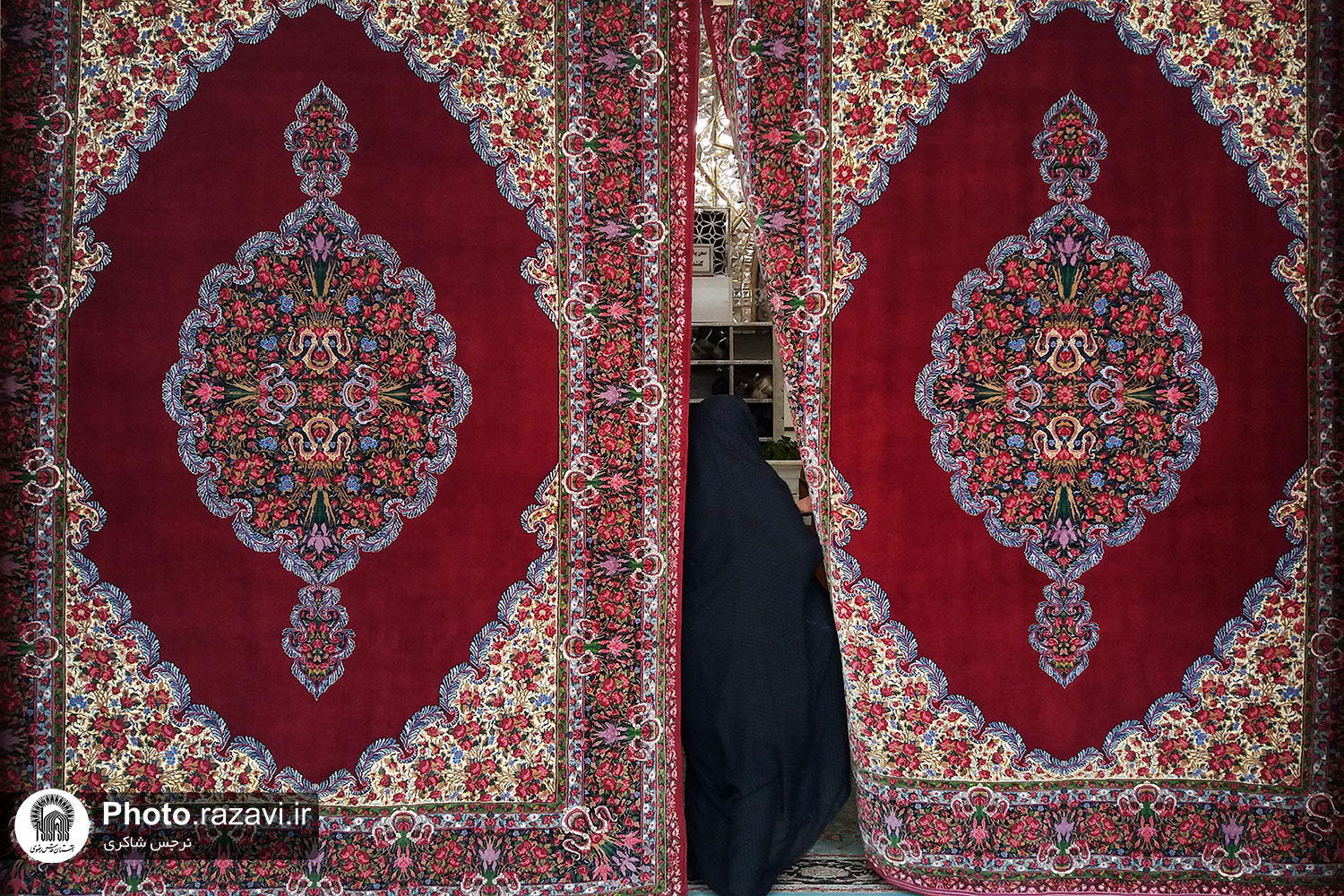 زیر پای زائرها یا آویزان به درگاه‌ها بستگی دارد کجا قسمتش شود. هر زائر که می‌خواهد وارد شود محو نقشه زیبایش می‌شود و دستی به رویش میکشد و داخل میشود. شاید اگر این فرش‌ها را مرز بهشت خواند بیراه نباشد.