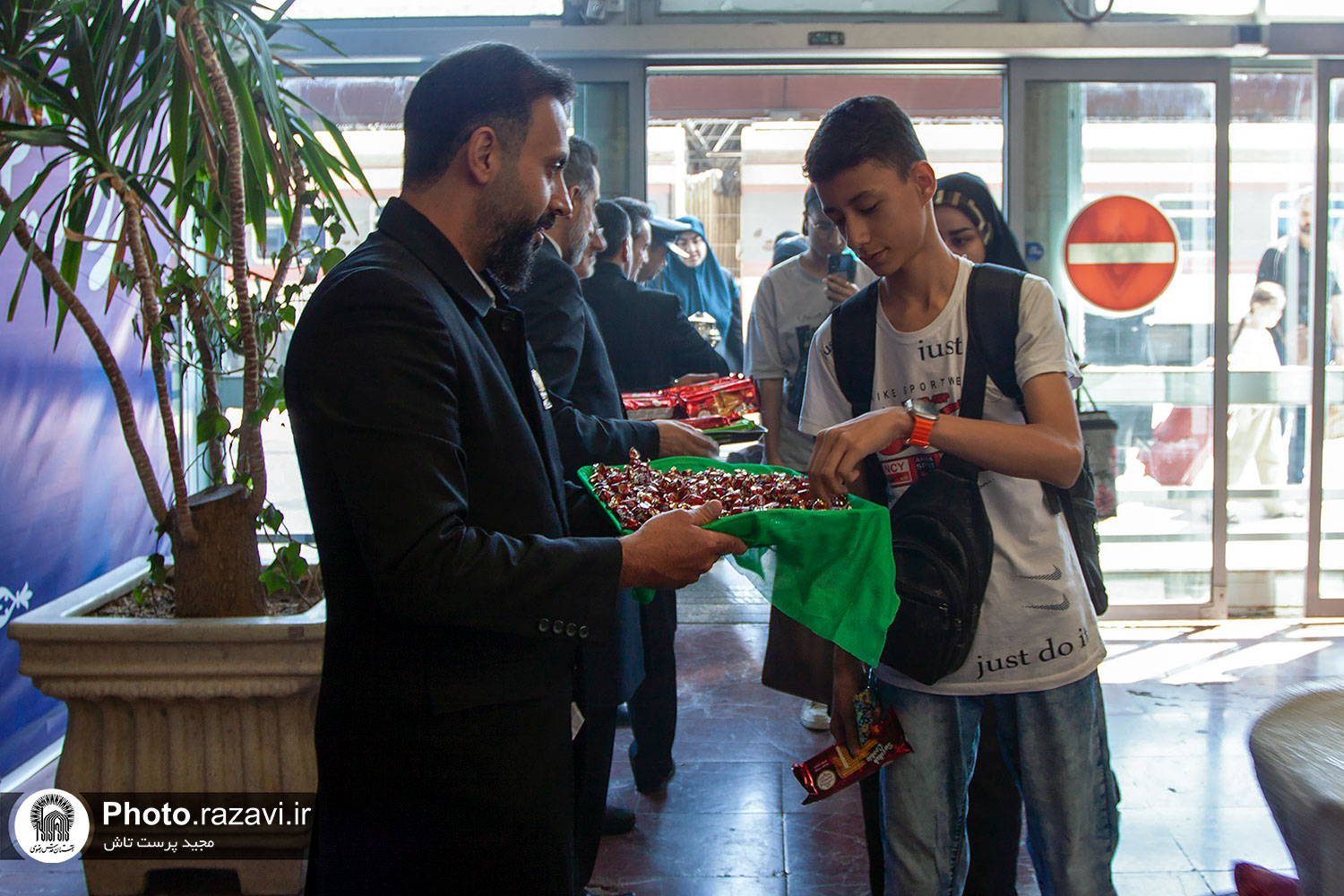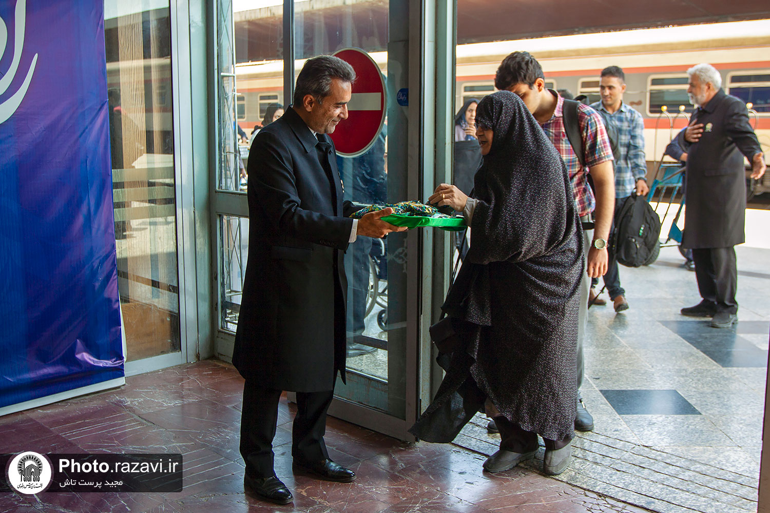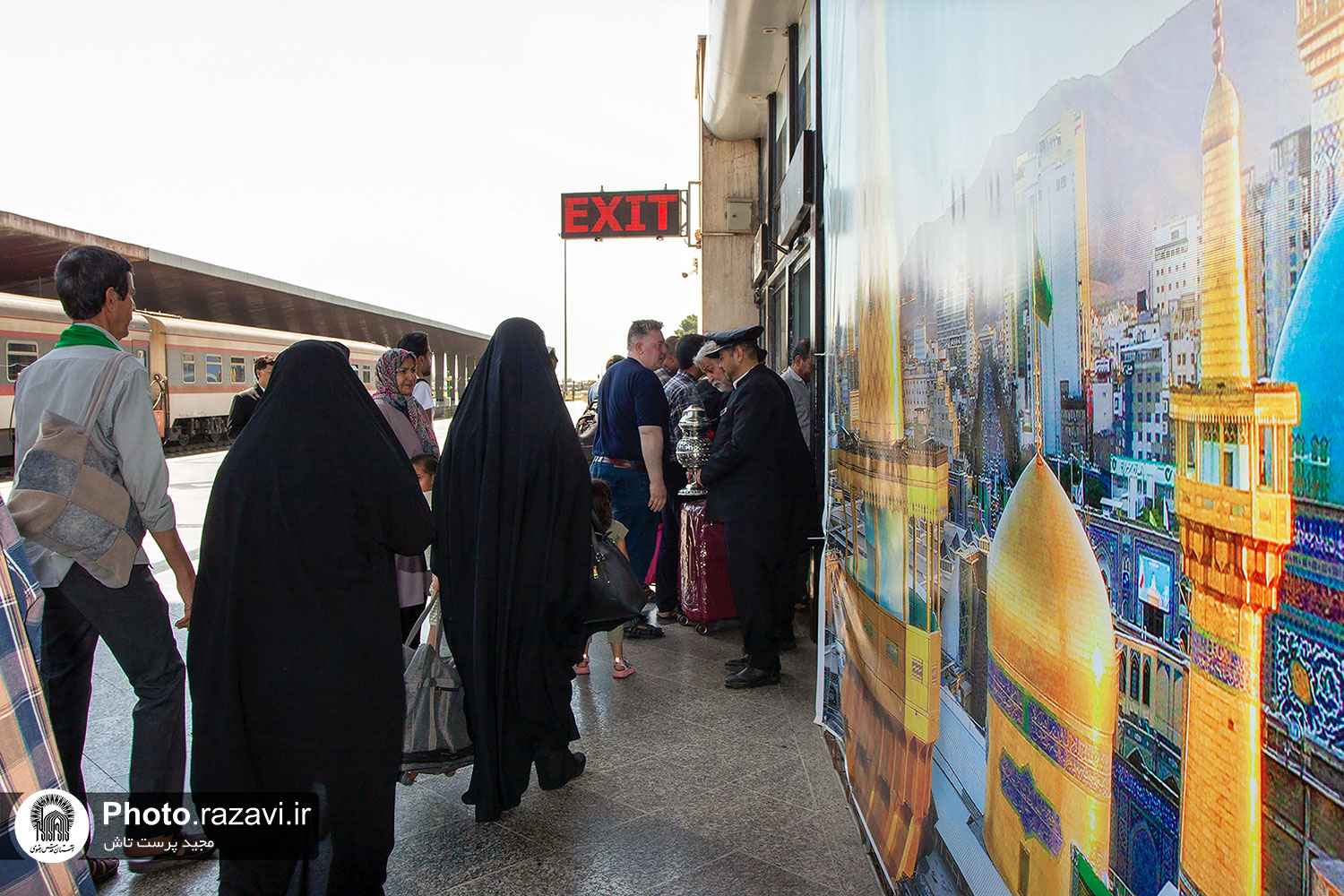 جمعی از خادمان بارگاه منور رضوی به مناسبت عید غدیر و ایام دهه ولایت با حضور در ایستگاه راه آهن شهید رئیسی مشهد ضمن خوشآمد به زائران امام رضا علیهالسلام با هدایای متبرک رضوی از زائران امام رئوف پذیرایی کردند.