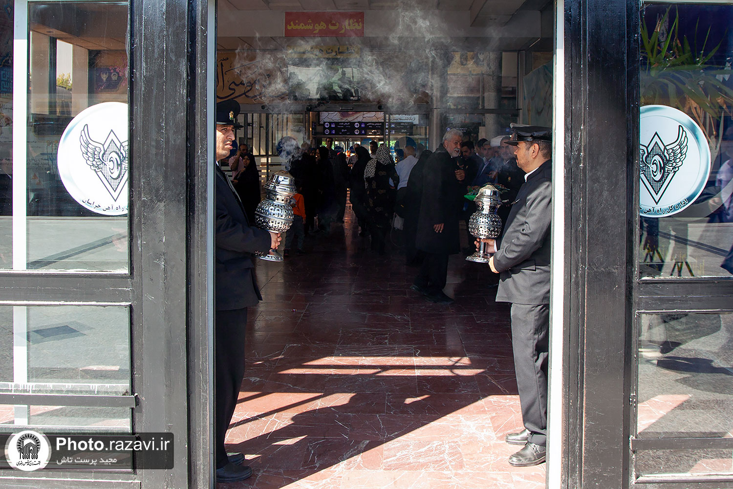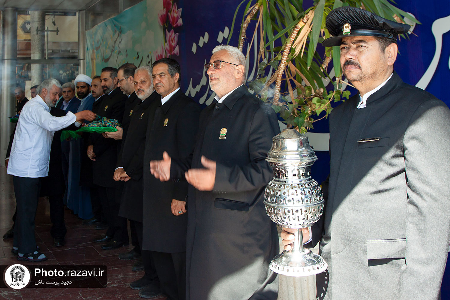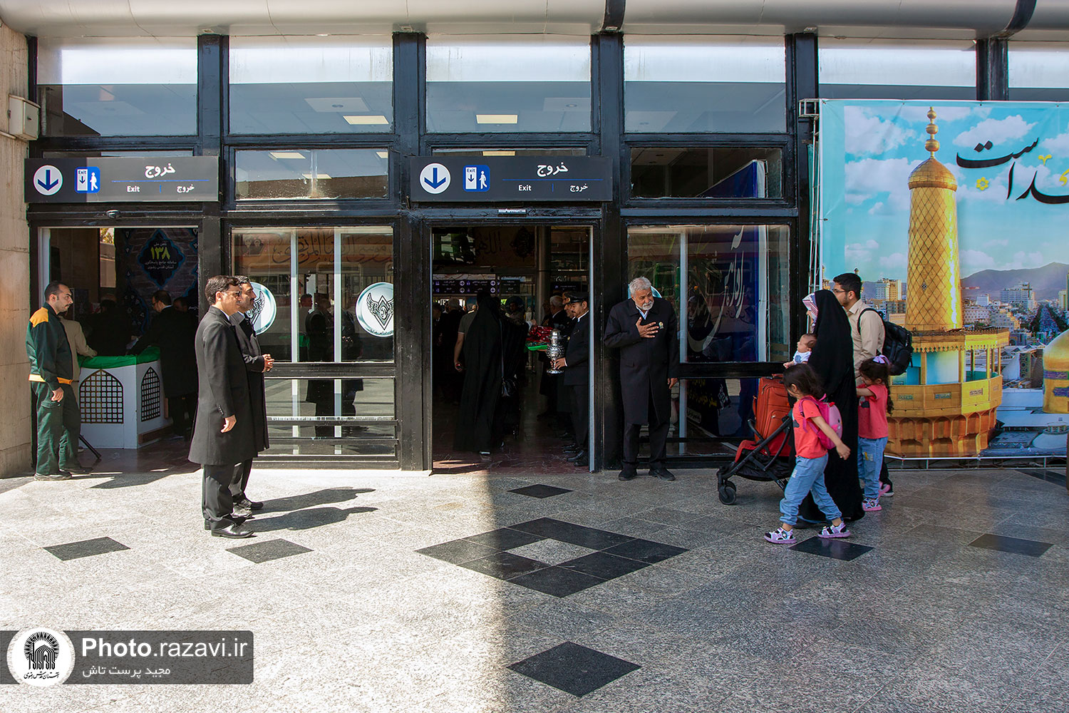 جمعی از خادمان بارگاه منور رضوی به مناسبت عید غدیر و ایام دهه ولایت با حضور در ایستگاه راه آهن شهید رئیسی مشهد ضمن خوشآمد به زائران امام رضا علیهالسلام با هدایای متبرک رضوی از زائران امام رئوف پذیرایی کردند.