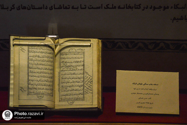 در ایام سوگواری سید و سالار شهیدان اباعبدالله الحسین(علیهالسلام) نمایشگاه طوفان البکاء با محوریت نمایش منتخبی از تصویرهای وقایع کربلا، برگرفته از کتاب «طوفان البکاء»، در سرسرای طبقه همکف کتابخانه و موزه ملی ملک برگزار شد. «طوفانُ البُكاء فی مَقاتِلِ الشُّهَداء»، کتابی فارسی است که به مصائب اهل بیت پیامبر(صلی الله علیه و آله) میپردازد.
