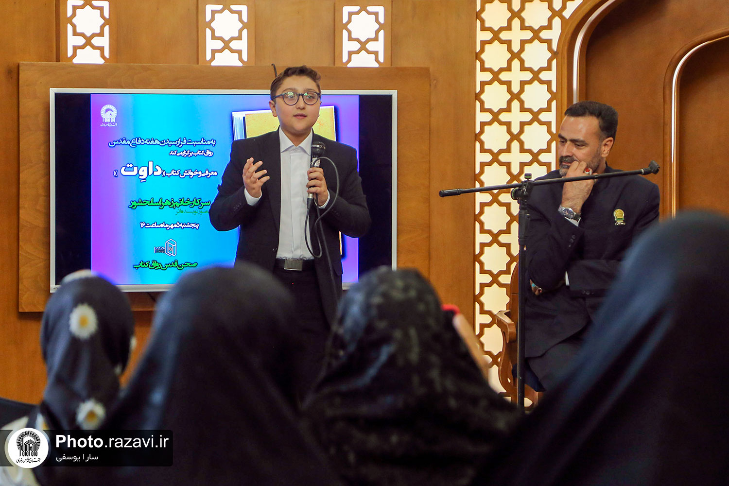 به مناسبت هفته دفاع مقدس بخشی از کتاب "داوِت" به قلم زهرا سلحشور؛ نویسنده اثر و سیدعلیرضا مهرداد، نویسنده و منتقد ادبیات داستانی در رواق کتاب صحن قدس معرفی و خوانش شد. "داوِت" اثری داستانی در حوزه ادبیات پایداری است که به معرفی زندگی رمضانعلی خردمند، رزمنده جنگ تحمیلی میپردازد.