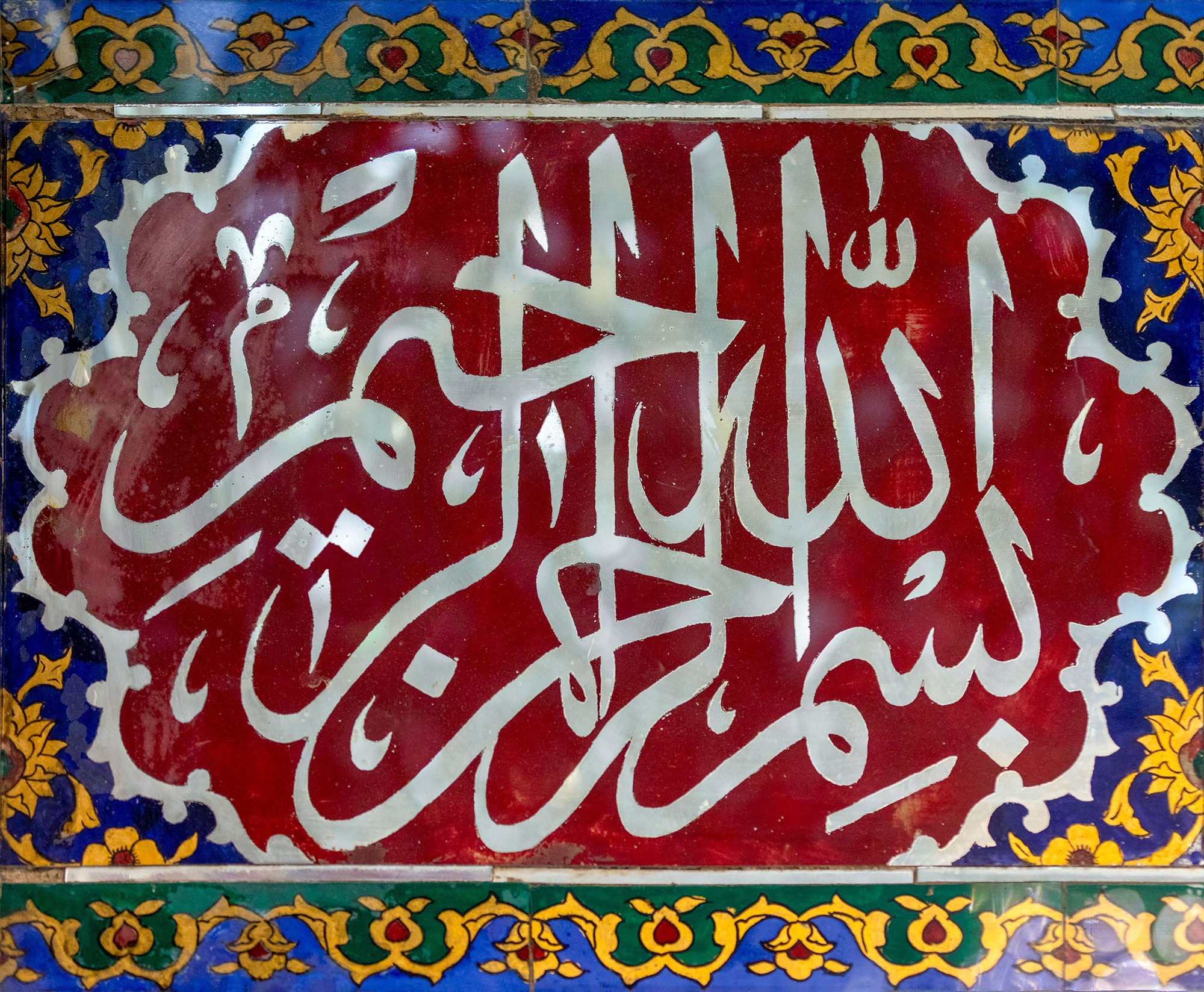 عکس با کیفیت : نقش بسم الله الرحمن الرحيم بر آینه کاری های ورودی رواق شیخ بهایی حرم مطهر رضوی