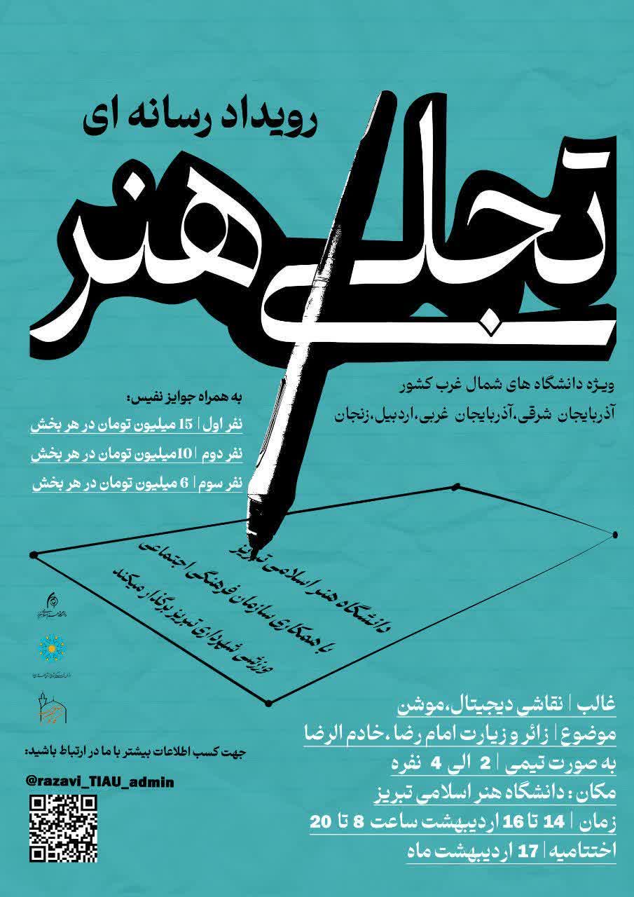 برای نمایش آرشیو پخش زنده کلیک کنیدمحمد مهدی جانفزا دبیر کانون خدمت رضوی دانشگاه هنر اسلامی تبریز در گفتگو با آستان نیوز اظهار داشت: رویداد رسانه ای تجلی هنر با دو قالب موشن و نقاشی دیجیتال با محور های زائر، زیارت امام رضا و خادم الرضا، شهدای راه خدمت ( شهید سید ابراهیم رئیسی،آیت الله آل هاشم و مالک رحمتی) ویژه دانشگاه های شمال غرب با همکاری سازمان فرهنگی اجتماعی و ورزشی شهرداری تبریز در دانشگاه هنر اسلامی تبریز در دهه کرامت برگزار می گردد.