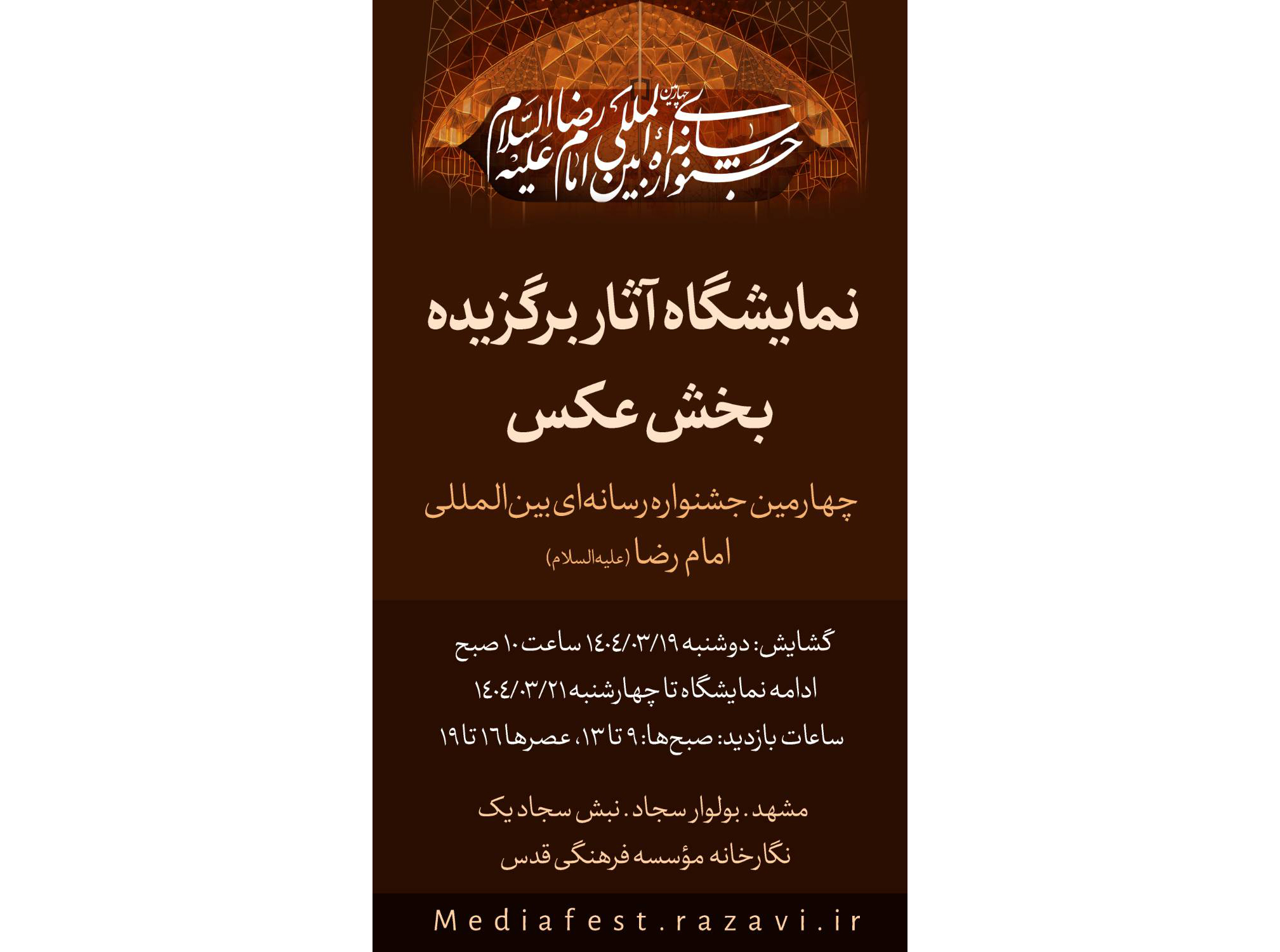 وی افزود: امسال نیز در حاشیه برگزاری چهارمین جشنواره رسانهای بینالمللی امام رضا (ع)، نمایشگاه عکس آثار برگزیده این دوره از جشنواره، از 19 لغایت 21 خرداد دایر خواهد شد و آثار منتخب در نگارخانه مؤسسه فرهنگی قدس، در معرض دید علاقهمندان، قرار خواهد گرفت.