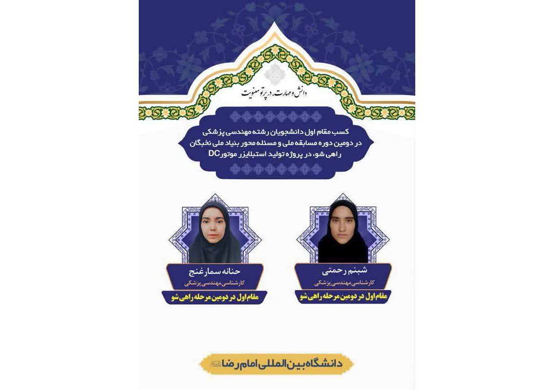 به گزارش آستان نیوز، «مهلا رحمتی» و «حنانه سمارغنج» دانشجویان رشته مهندسی پزشكی گرایش بیوالكتریك دانشگاه بین‌المللی امام رضا (ع) در پروژه «تولید دستگاه استبلایزر DC»، مقام اول و افتخارآمیز دومین دوره مسابقه ملی و مسئله‌محور بنیاد ملی نخبگان، «راهی شو» را، كسب كردند.