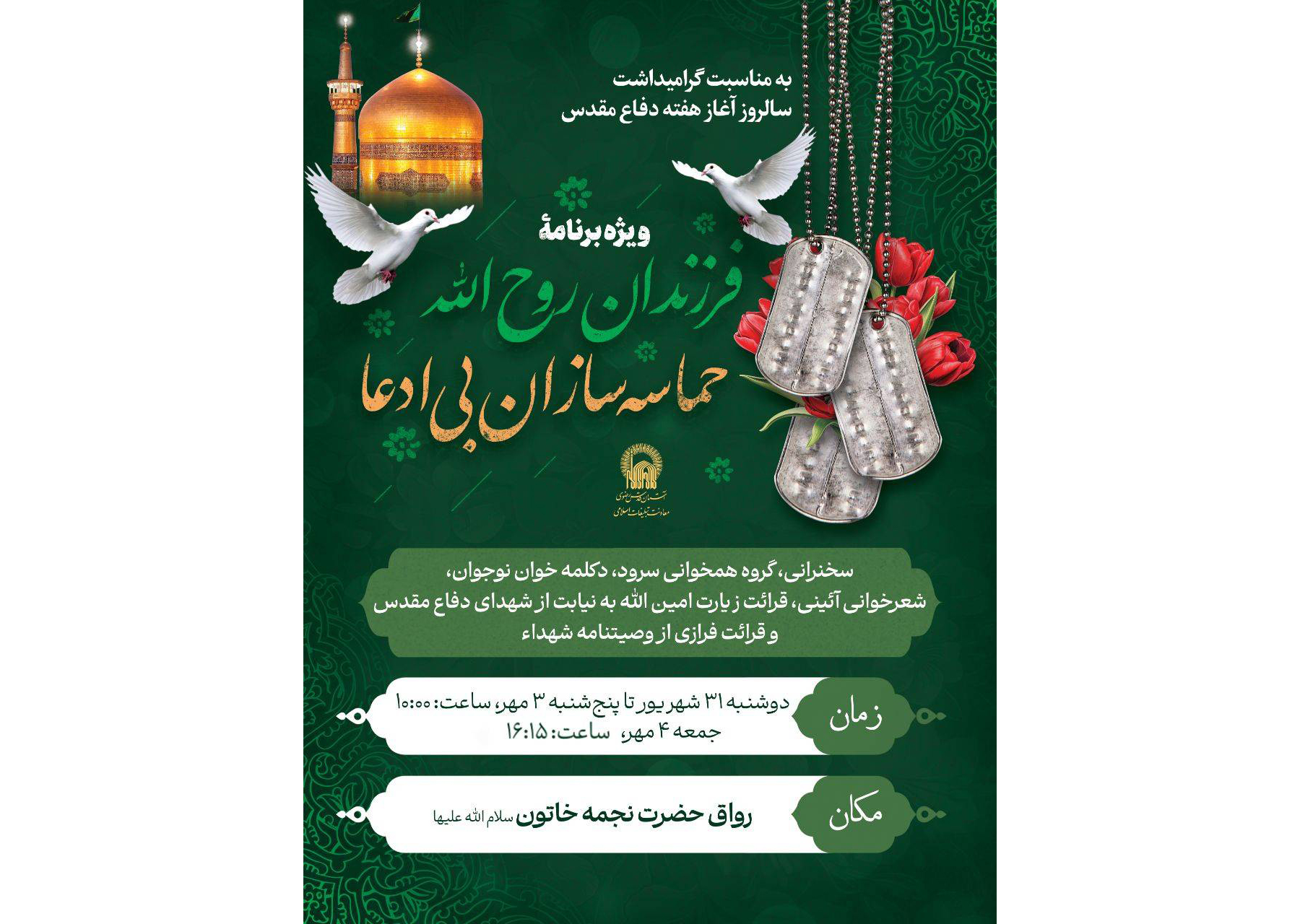 اجرای برنامه سخنرانی با موضوع نقشآفرینی رزمندگان هشت سال هفته دفاع مقدس و همچنین قرائت ادعیه و زیارات به نیابت از شهدای سرافراز و قرائت فرازی از وصیت نامه آنها از دیگر بخشهایی است که در این ویژه برنامه اجرا خواهد شد.