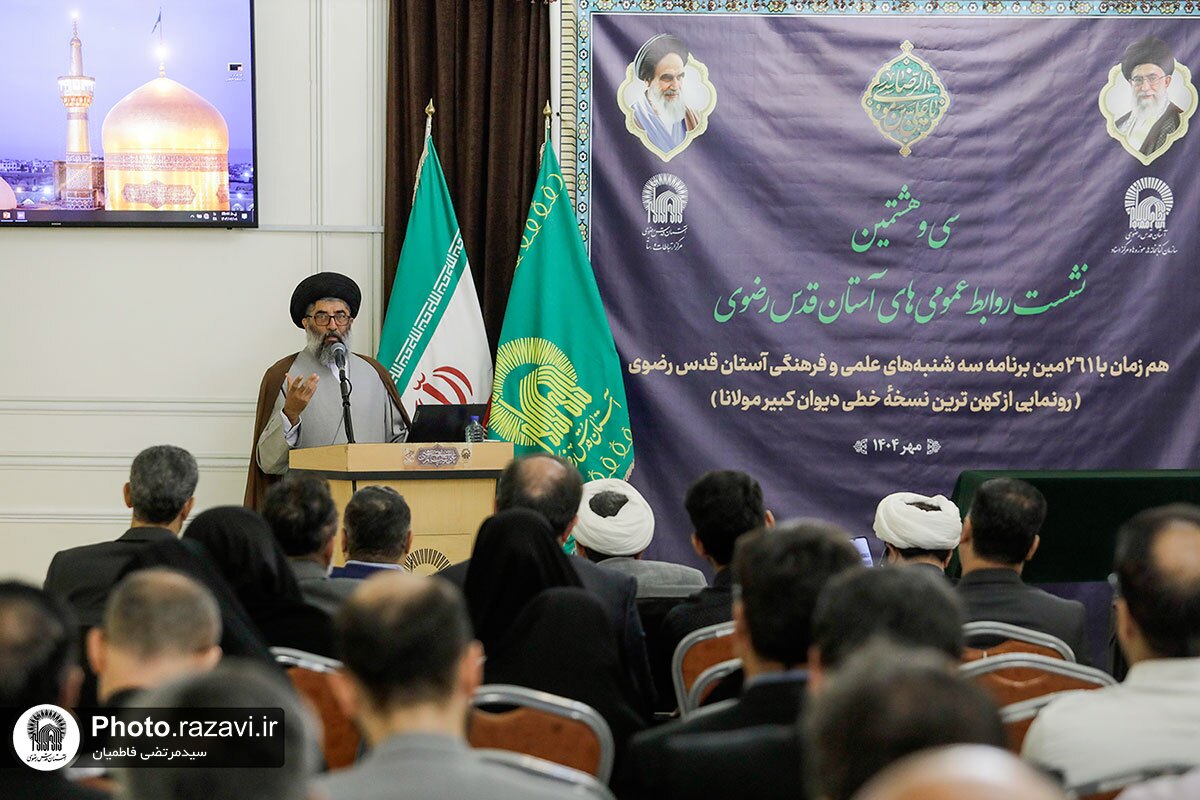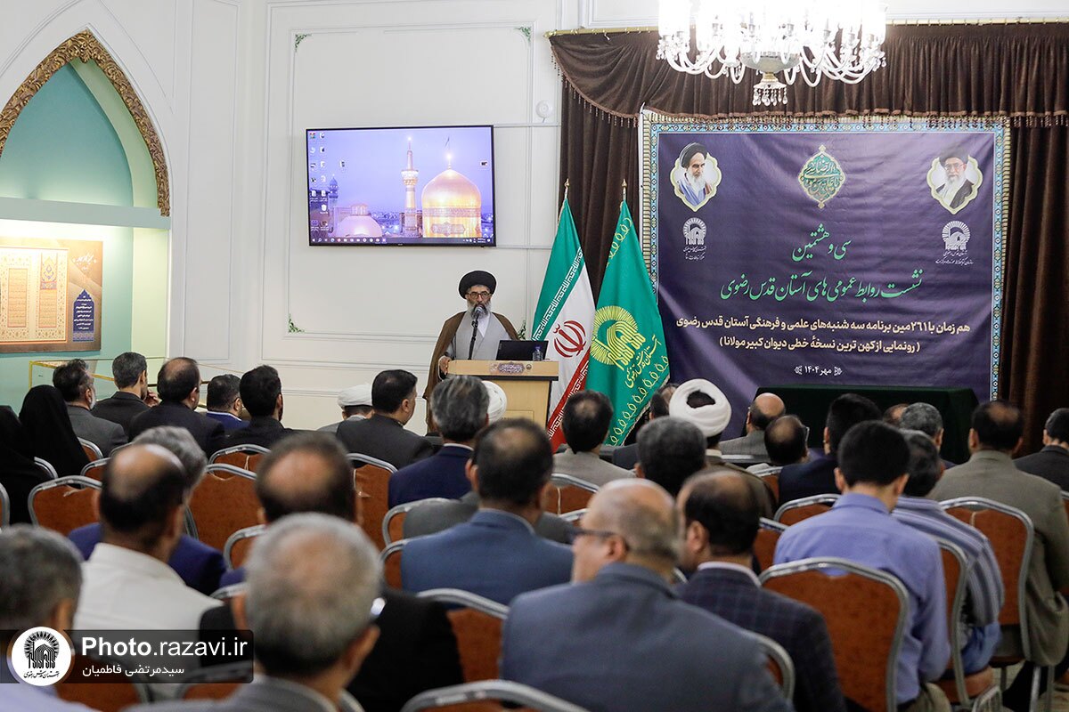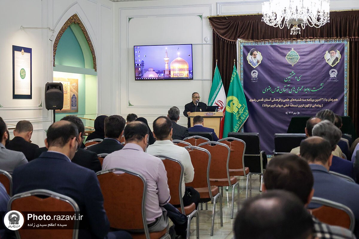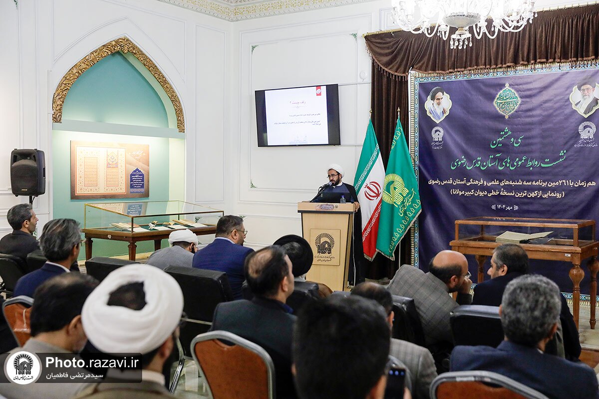 دویست و شصت و یکمین برنامه سهشنبههای علمی و فرهنگی با محوریت رونمایی از قدیمیترین نسخه خطی «دیوان کبیر مولوی» در ایران، همزمان با سی و هشتمین نشست روابط عمومیهای آستان قدس رضوی، روز سهشنبه 8 مهر 1404 با حضور جمعی از رؤسا، مدیران و کارشناسان این آستان مقدس، در گنجینه قرآن و نفایس حرم امام رضا علیهالسلام برگزار شد.
