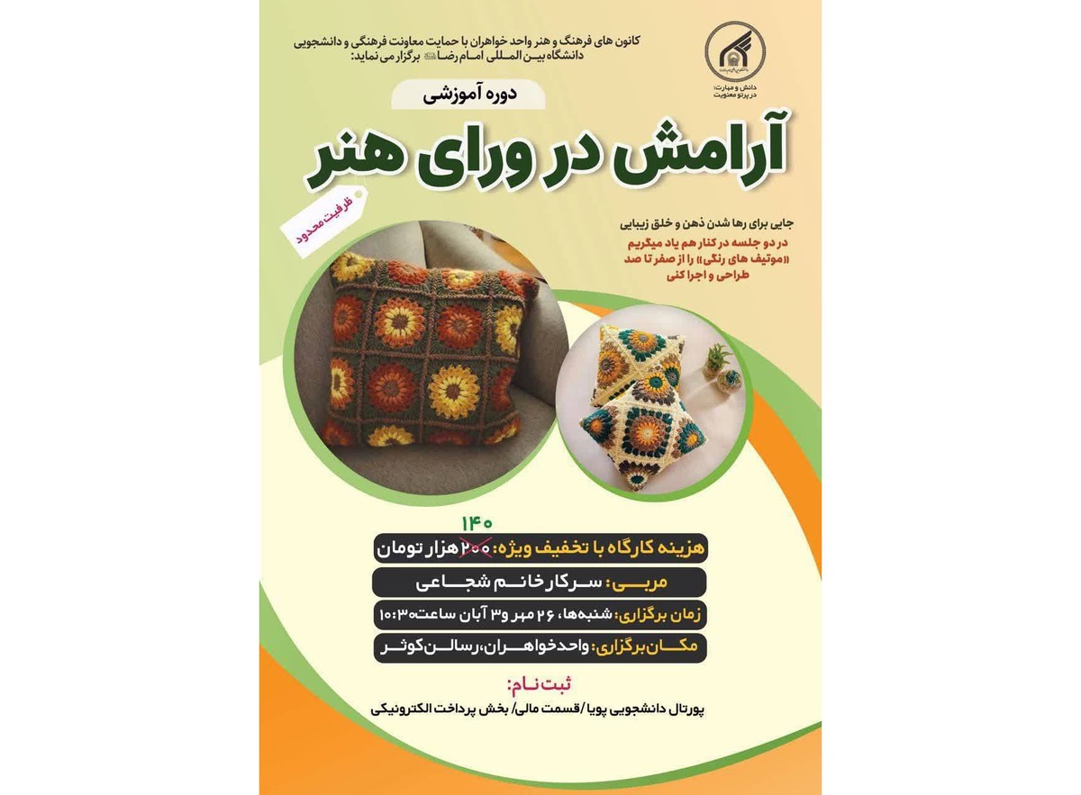 دوره آموزشی موتیف‌های رنگی ۲۶ مهر و ۳ آبان ماه، ساعت: ۱۰:۳۰ صبح در سالن کوثر واحد خواهران دانشگاه بین‌المللی امام رضا (ع) برگزار می‌شود.