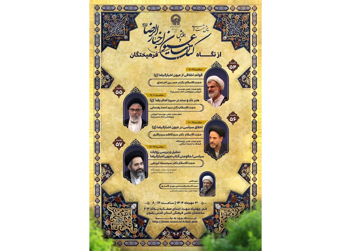 زمان برگزاری این نشستها نیز از ساعت ۸ تا ۱۲ چهارشنبه ۳۰ مهر ۱۴۰۴ خواهد بود و محل برگزاری آن در قم، چهارراه شهدا - ابتدای خیابان صفائیه، سازمان علمی و فرهنگی آستان قدس رضوی - سالن شیخ طوسی، تعیین شده است.