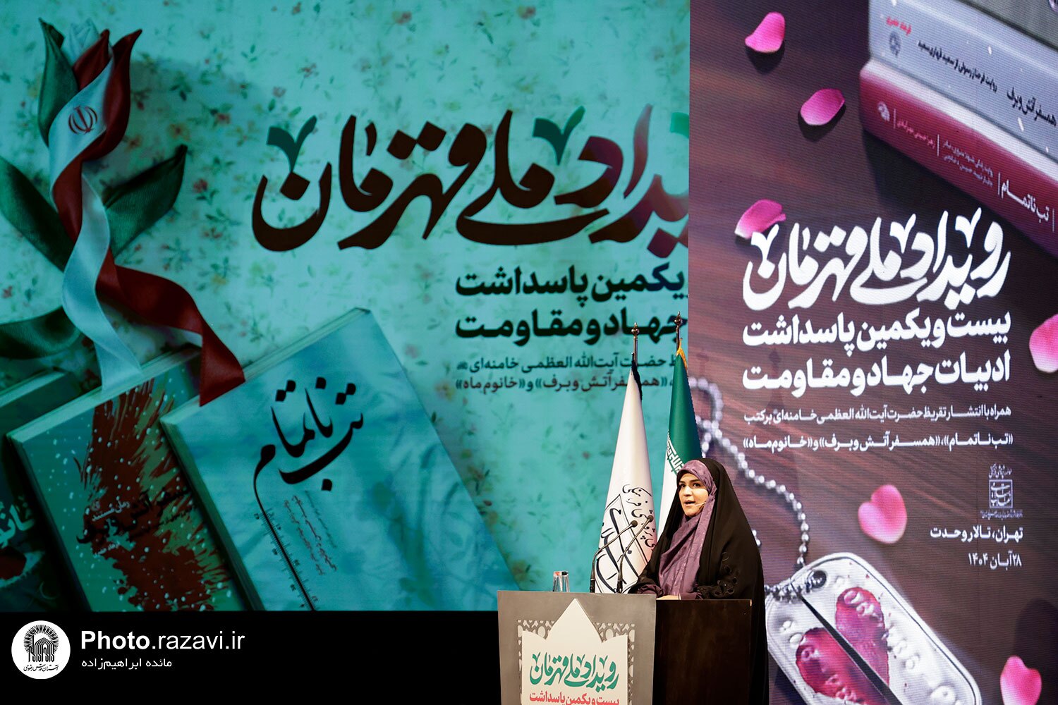 دومین رویداد ملی «قهرمان»، بیست و یکمین پاسداشت ادبیات جهاد و مقاومت همراه با انتشار تقریظهای رهبر معظم انقلاب اسلامی بر کتابهای "خانوم ماه"، "تب ناتمام" و "همسفر آتش و برف"، روز چهارشنبه ۲۸ آبان ۱۴۰۴ با حضور آیت الله محمد محمدی گلپایگانی؛ رئیس دفتر مقام معظم رهبری، سید عباس صالحی؛ وزیر ارشاد و جمعی از خانواده شهدا در تالار وحدت تهران برگزار شد.
