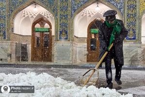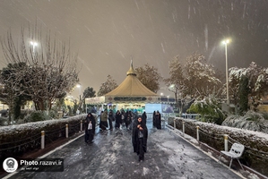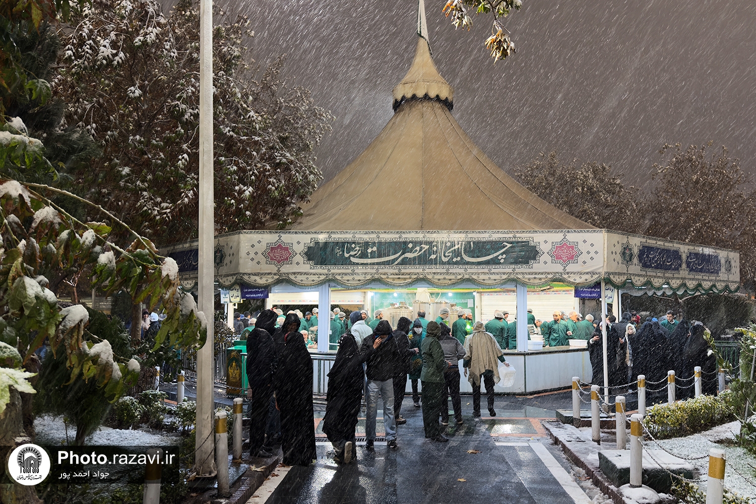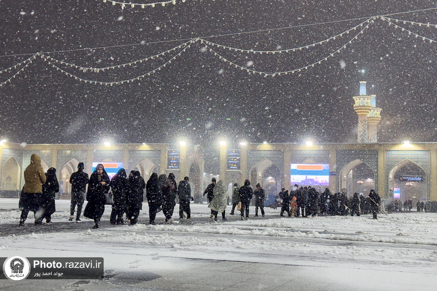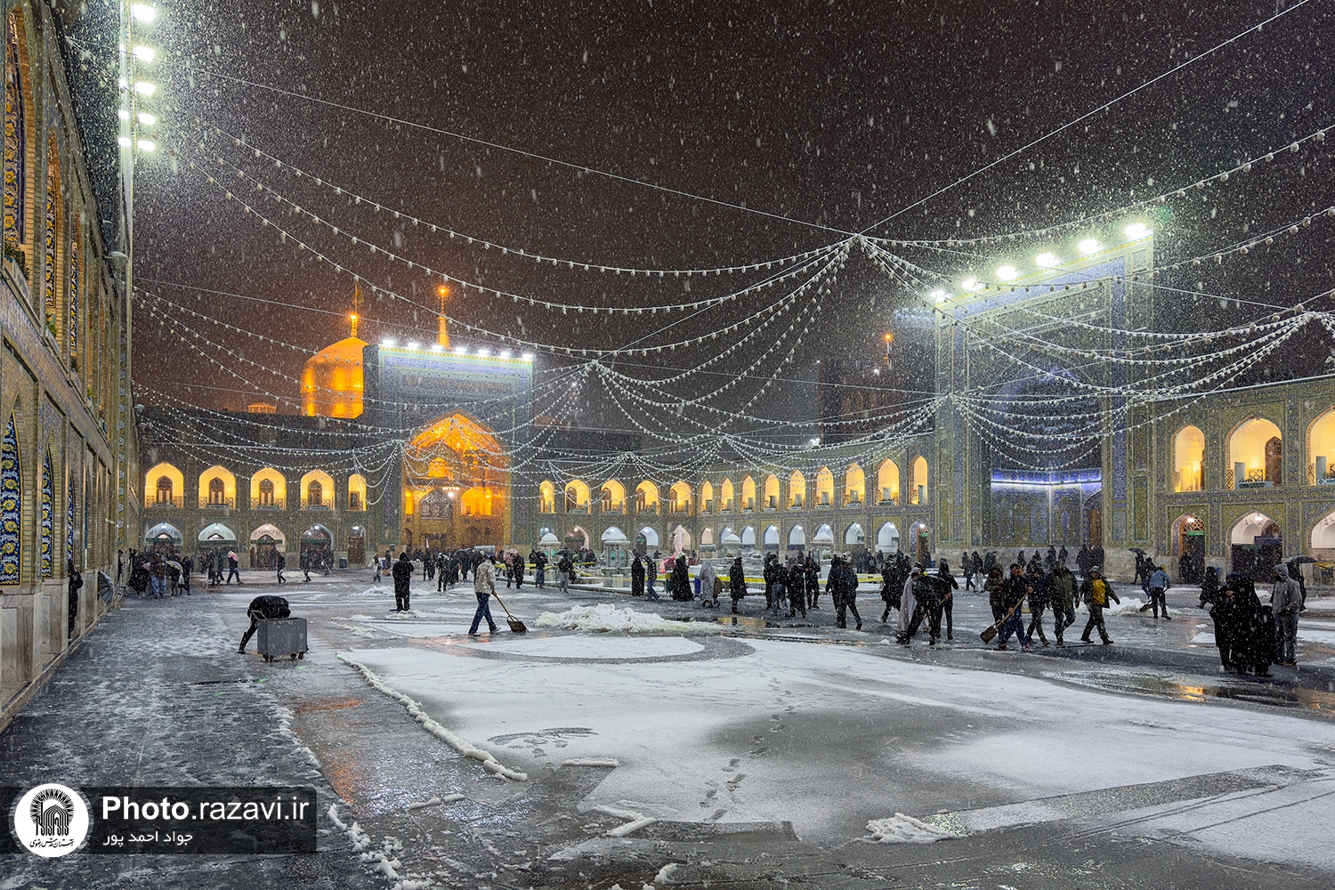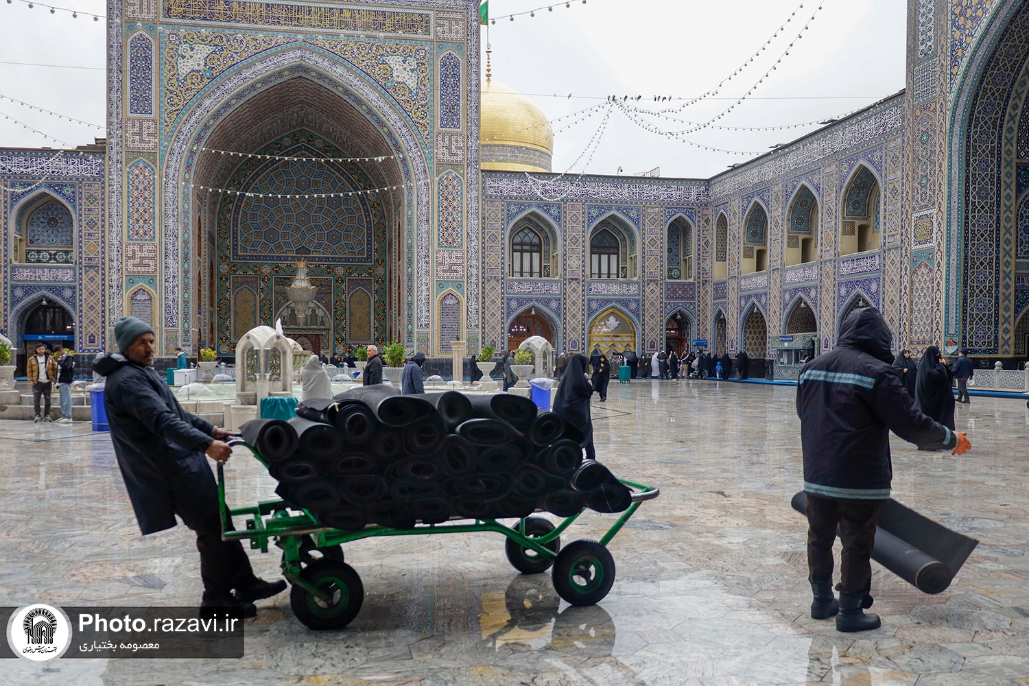 با ورود توده هوای سرد به شمال شرق کشور در روز چهارشنبه ۲۶ آذر ۱۴۰۴ و ادامه آن تا بامداد پنجشنبه، صحنها و رواقهای حرم مطهر رضوی شاهد بارش باران و برف بودند. این شرایط جوی جلوهای معنوی و چشمنواز به فضای حرم بخشید. خادمان بارگاه منور رضوی نیز با پهن کردن کفپوشها در صحنها، ایمنی و آرامش زائران را تضمین کردند.