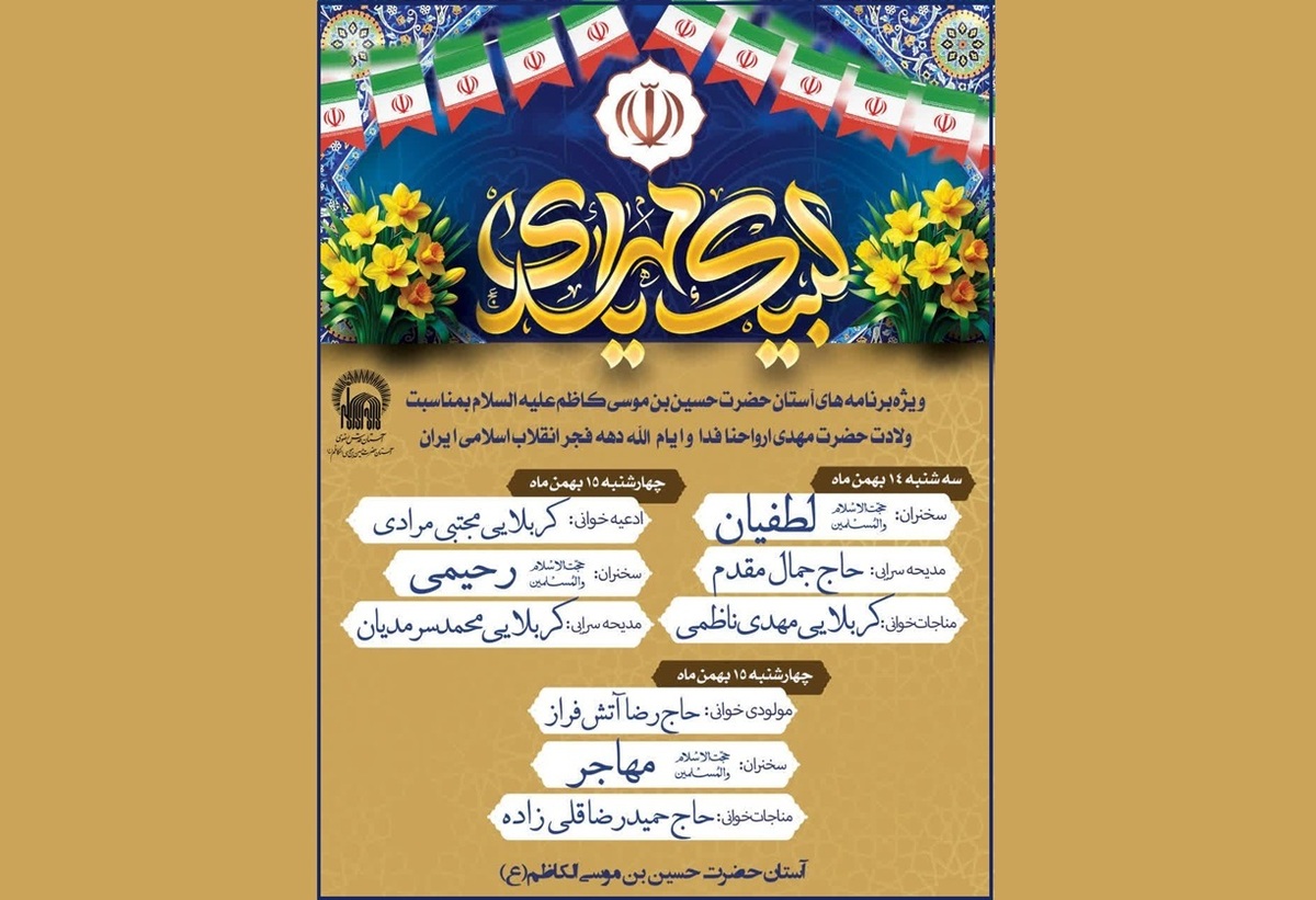 این برنامهها در روزهای سهشنبه و چهارشنبه، چهاردهم و پانزدهم بهمنماه با حضور حججاسلام لطفیان، مهاجر و رحیمی بهعنوان سخنرانان و جمعی از مداحان برجسته کشور از جمله حاج جمال مقدم، حاج حمیدرضا قلیزاده و کربلایی مجتبی مرادی برگزار خواهد شد. این آیین معنوی، فرصتی برای تازه شدن تجدید میثاق با حضرت مهدی (عج) و تجلی شور انتظار در فضای نورانی آستان مبارک حضرتحسینبنموسیالکاظم (ع) است.