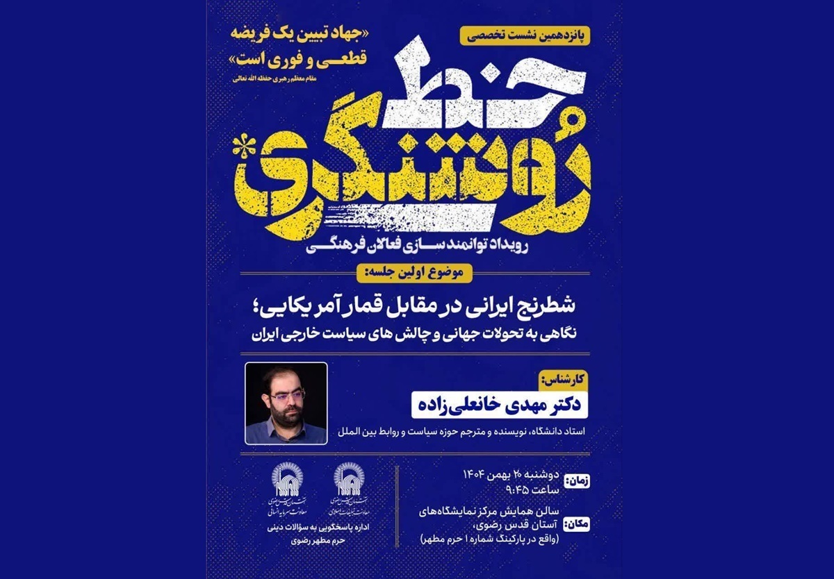 شایانذکر است، سلسلهنشستهای تخصصی «خط روشنگری» باهدف ارتقای سطح آگاهی، تحلیلگری و نگاه راهبردی میان اقشار فرهنگی و کارکنان و خدام حرم مطهر رضوی توسط اداره پاسخگویی به سؤالات دینی تدارکدیدهشده است.