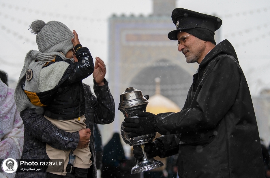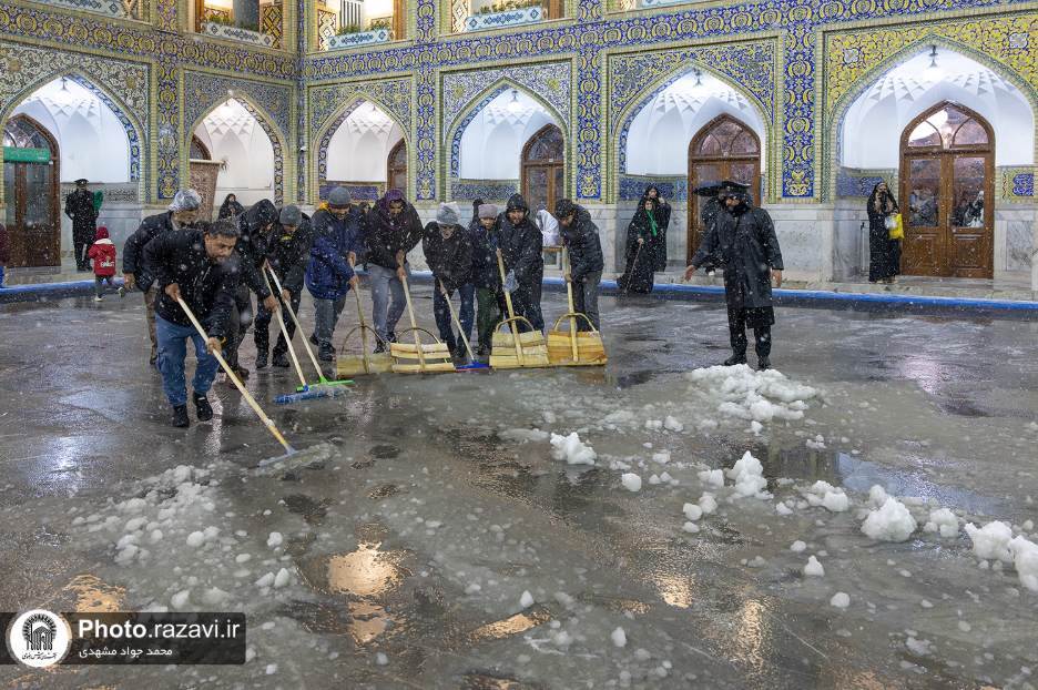 مؤرخہ 19 دسمبر2025 بروز جمعہ کو ملک کے شمال مشرقی حصے سے سرد ہواؤں کے داخل ہونے کے بعد بروز ہفتے سے خزاں کی برفباری شروع ہوگئی ،جس سے حرم امام رضا(ع)میں آنکھوں کو بھا جانے والے مناظر دیکھنے کو ملے ، حرم امام رضا علیہ السلام کے خادمین نےبارش اور برفباری کے دوران زائرین کو سہولیات فراہم کرنے کے مقصد سےحرم مطہر کے صحنوں میں کارپٹ بچھائے اورصحنوں میں پڑھی برف کی صفائی کی۔